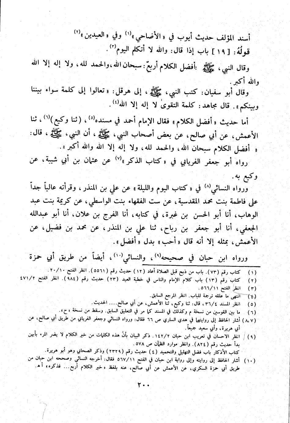 وَأما حَدِيث أفضل الْكَلَام فَقَالَ الإِمَام أَحْمد فِي مُسْنده ثَنَا وَكِيعٌ ثَنَا الأَعْمَشِ عَنْ أَبِي صَالِحٍ عَنْ بعض أَصْحَاب النَّبِي صلى الله عَلَيْهِ وَسَلَّمَ أَن النَّبِي صلى اللَّهُ عَلَيْهِ وَسَلَّمَ قَالَ أَفْضَلُ الْكَلامِ سُبْحَانَ اللَّهِ وَالْحَمْدُ لِلَّهِ وَلَا إِلَه إِلَّا الله وَالله أَكْبَرُ