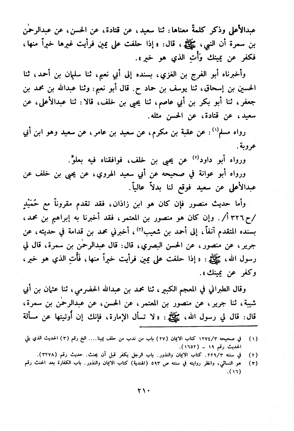 وَأما حَدِيث مَنْصُور فَإِن كَانَ هُوَ ابْن زَاذَان فقد تقدم مَقْرُونا مَعَ حميد ح 326 أوَإِن كَانَ هُوَ مَنْصُور بن الْمُعْتَمِر فَقَدْ أَخْبَرَنَا بِهِ إِبْرَاهِيمُ بْنُ مُحَمَّدٍ بِسَنَدِهِ الْمُتَقَدِّمِ آنِفًا إِلَى أَحْمَدَ بْنِ شُعَيْبٍ أَخْبَرَنِي مُحَمَّدُ بْنُ قُدَامَةَ فِي حَدِيثِهِ عَن جرير عَن مَنْصُور عَن الْحَسَنِ الْبَصْرِيِّ قَالَ قَالَ عَبْدُ الرَّحْمَنِ بْنُ سَمُرَةَ قَالَ لِي رَسُول الله صلى الله عَلَيْهِ وَسَلَّمَ إِذَا حَلَفْتَ عَلَى يَمِينٍ فَرَأَيْتَ خَيْرًا مِنْهَا فَأْتِ الَّذِي هُوَ خَيْرٌ وَكَفِّرْ عَنْ يَمِينِكَ