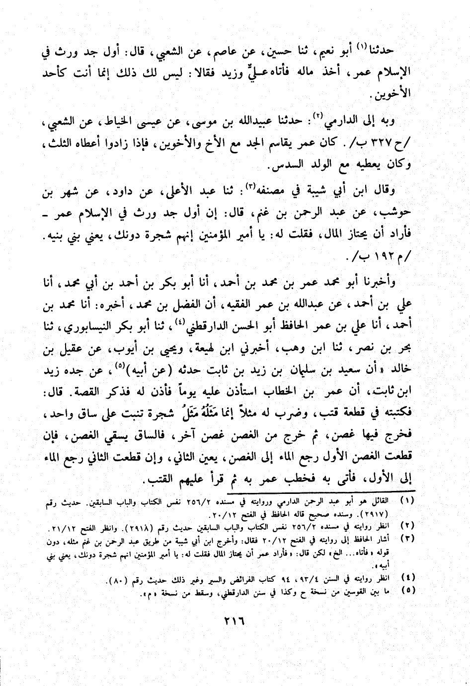 وَقَالَ ابْنُ أَبِي شَيْبَةَ فِي مُصَنَّفِهِ ثَنَا عَبْدُ الأَعْلَى عَنْ دَاوُدَ عَنْ شَهْرِ بْنِ حَوْشَبٍ عَنْ عَبْدِ الرَّحْمَنِ بْنِ غَنْمٍ قَالَ إِنَّ أَوَّلَ جَدٍّ وَرِثَ فِي الإِسْلامِ عُمَرُ فَأَرَادَ أَنْ يَحْتَازَ الْمَالَ فَقُلْتُ لَهُ يَا أَمِيرَ الْمُؤْمِنِينَ إِنَّهُمْ شَجَرَةٌ دُونك يَعْنِي بني بنيه م 192 ب