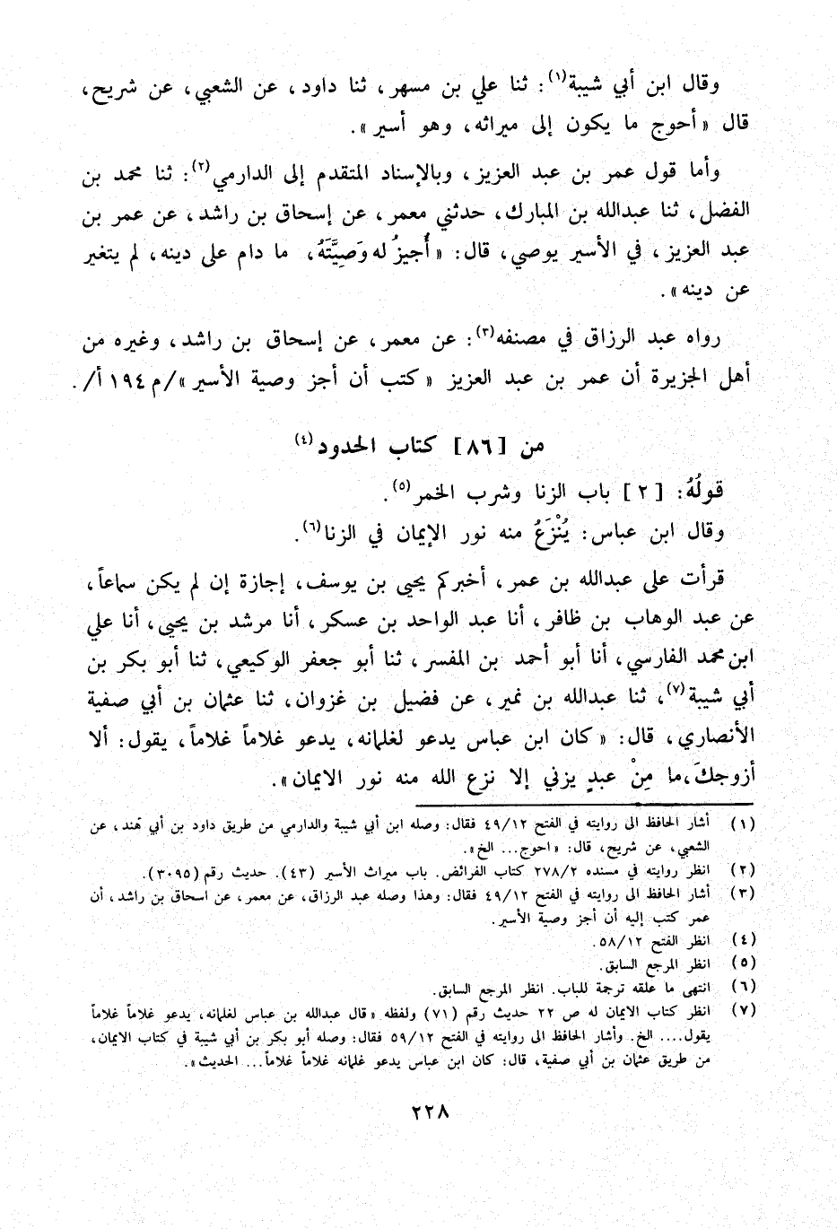قَرَأت على عبد الله بن عُمَرَ أَخْبَرَكُمْ يَحْيَى بْنُ يُوسُفَ إجَازَة إِن لم يكن سَمَاعا عَن عبد الْوَهَّاب بن ظافر أَنا عَبْدُ الْوَاحِدِ بْنُ عَسْكَرٍ أَنا مرشد بن يحيى أَنا عَليّ ابْن مُحَمَّدٍ الْفَارِسِيُّ أَنا أَبُو أَحْمَدَ بْنُ الْمُفَسِّرِ ثَنَا أَبُو جَعْفَرٍ الوكيعي ثَنَا أَبُو بكر بن أبي شيبَة ثَنَا عبد الله بْنُ نُمَيْرٍ عَنْ فُضَيْلِ بْنِ غَزْوَانَ ثَنَا عُثْمَانُ بْنُ أَبِي صَفِيَّةَ الأَنْصَارِيُّ قَالَ كَانَ ابْنُ عَبَّاسٍ يَدْعُو لِغِلْمَانِهِ يَدْعُو غُلامًا غُلامًا يَقُولُ أَلا أُزَوِّجُكَ مَا مِنْ عَبْدٍ يَزْنِي إِلا نَزَعَ الله مِنْهُ نور الْإِيمَان