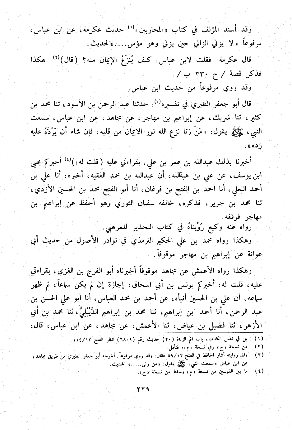 قَالَ أَبُو جَعْفَر الطَّبَرِيّ فِي تَفْسِيره حَدَّثَنَا عَبْدُ الرَّحْمَنِ بْنُ الأَسْوَدِ ثَنَا مُحَمَّدُ بْنُ كَثِيرٍ ثَنَا شَرِيكٌ عَنْ إِبْرَاهِيمَ بْنِ مُهَاجِرٍ عَنْ مُجَاهِدٍ عَنِ ابْنِ عَبَّاسٍ سَمِعْتُ النَّبِيَّ صَلَّى اللَّهُ عَلَيْهِ وَسَلَّمَ يَقُولُ من زنا نَزَعَ اللَّهُ نُورَ الإِيمَانِ مِنْ قَلْبِهِ فَإِنْ شَاءَ أَنْ يَرُدَّهُ عَلَيْهِ رَدَّهُ