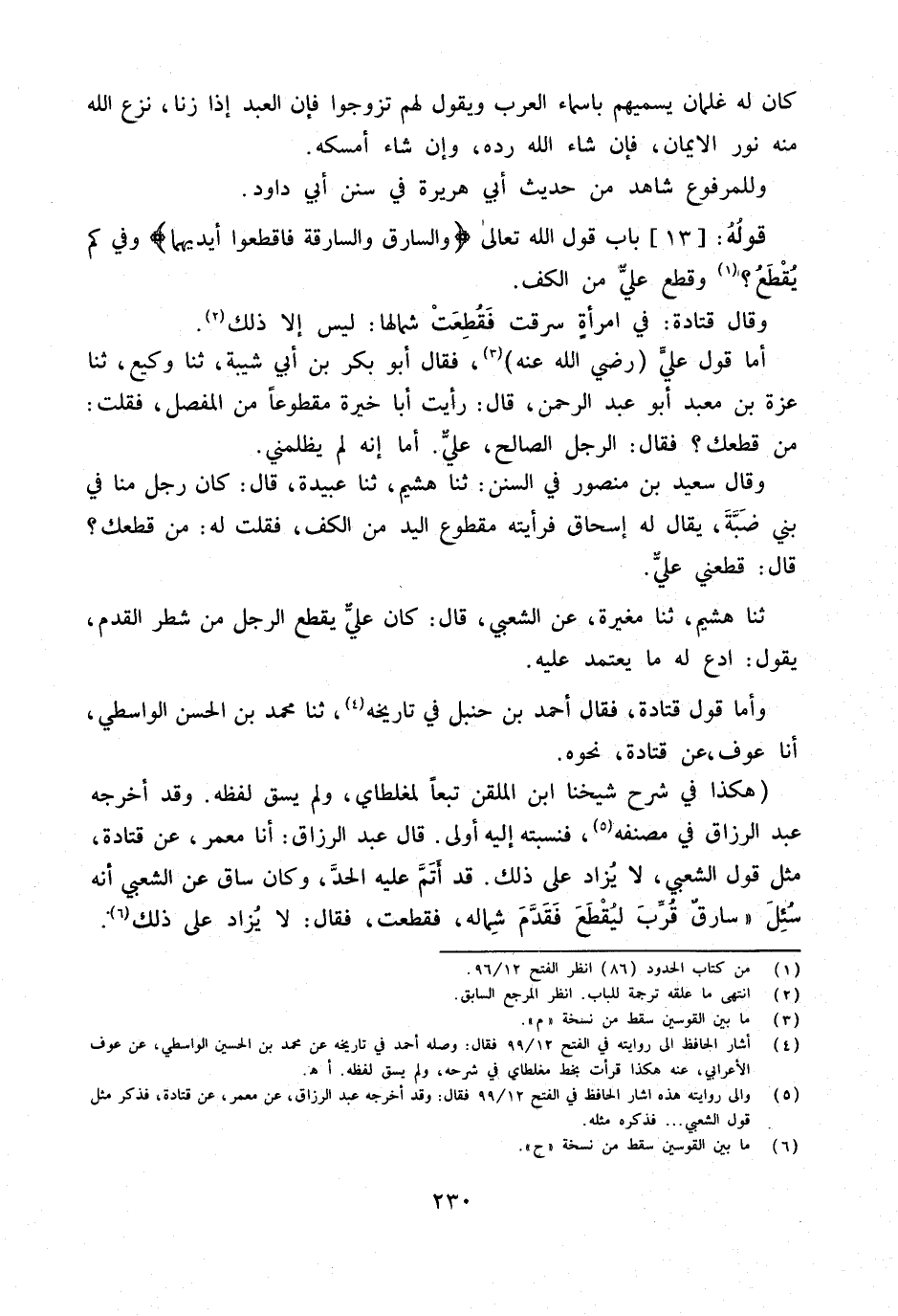 وَقَالَ سعيد بن مَنْصُور فِي السّنَن ثَنَا هُشَيْمٌ ثَنَا عُبَيْدَةُ قَالَ كَانَ رَجُلٌ مِنَّا فِي بَنِي ضَبَّةَ يُقَالُ لَهُ إِسْحَاقُ فَرَأَيْتُهُ مَقْطُوعَ الْيَدِ مِنَ الْكَفِّ فَقُلْتُ لَهُ مَنْ قَطَعَكَ قَالَ قَطَعَنِي عَلِيٌّ