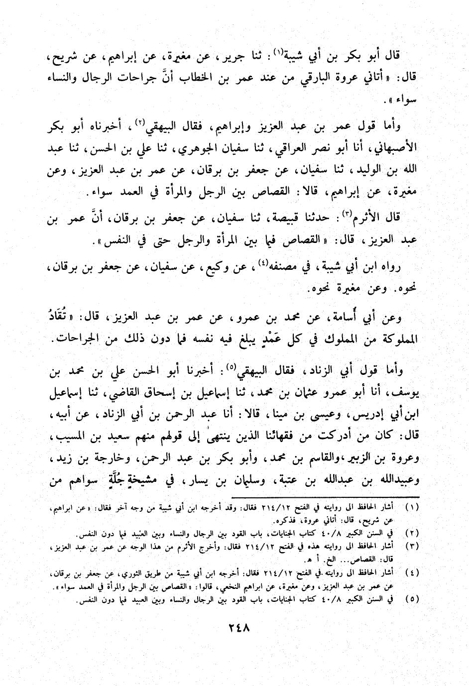 وَأما قَول عمر بن عبد الْعَزِيز وَإِبْرَاهِيم فَقَالَ الْبَيْهَقِيّ أخبرناه أَبُو بكر الأَصْبَهَانِيُّ أَنا أَبُو نَصْرٍ الْعِرَاقِيُّ ثَنَا سُفْيَان الْجَوْهَرِي ثَنَا عَليّ بن الْحسن ثَنَا عبد الله بْنُ الْوَلِيدِ ثَنَا سُفْيَانُ عَنْ جَعْفَر بن برْقَان عَن عمر بن عبد الْعَزِيز وَعَن مُغيرَة عَن إِبْرَاهِيم قَالَا الْقصاص بَين الرجل وَالْمَرْأَة فِي الْعمد سَوَاء