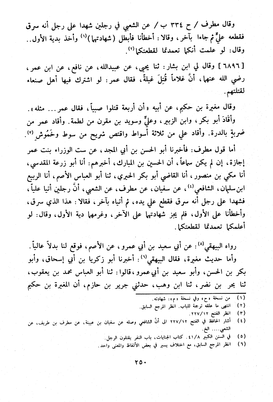 وَأما قَول مطرف فَأَخْبَرَنَا أَبُو الْحَسَنِ بْنُ أَبِي الْمَجْدِ عَنْ سِتِّ الْوُزَرَاءِ بِنْتِ عُمَرَ إِجَازَةً إِنْ لَمْ يَكُنْ سَمَاعًا أَنَّ الْحُسَيْنَ بْنَ الْمُبَارَكِ أَخْبَرَهُمْ أَنا أَبُو زُرْعَةَ الْمَقْدِسِيُّ أَنا مَكِّيُّ بْنُ مَنْصُور أَنا القَاضِي أَبُو بكر الْحِيرِيُّ ثَنَا أَبُو الْعَبَّاسِ الأَصَمُّ أَنا الرّبيع ابْن سُلَيْمَانَ الشَّافِعِيُّ عَنْ سُفْيَانَ عَنْ مُطَرِّفٍ عَنِ الشَّعْبِيِّ أَنَّ رَجُلَيْنِ أَتَيَا عَلِيًّا فَشَهِدَا عَلَى رَجُلٍ أَنَّهُ سَرَقَ فَقَطَعَ عَلِيٌّ يَدَهُ ثُمَّ أَتَيَاهُ بِآخَرَ فَقَالا هَذَا الَّذِي سَرَقَ وَأَخْطَأْنَا عَلَى الأَوَّلِ فَلَمْ يُجِزْ شَهَادَتَهُمَا عَلَى الآخَرِ وَغَرَّمَهُمَا دِيَةَ الأَوَّلِ وَقَالَ لَوْ أَعْلَمْكُمَا تَعَمَّدْتُمَا لَقَطَعْتُكُمَا