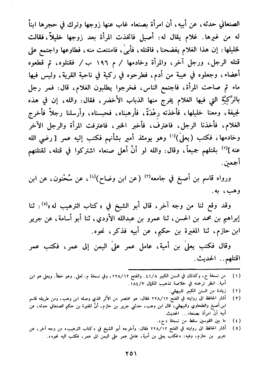 الصَّنْعَانِيَّ حَدَّثَهُ عَنْ أَبِيهِ أَنَّ امْرَأَةً بِصَنْعَاءَ غَابَ عَنْهَا زَوْجُهَا وَتَرَكَ فِي حِجْرِهَا ابْنًا لَهُ مِنْ غَيْرِهَا غُلامٌ يُقَالُ لَهُ أَصِيلٌ فَاتَّخَذَتِ الْمَرْأَةُ بَعْدَ زَوْجِهَا خَلِيلا فَقَالَتْ لِخَلِيلِهَا إِنَّ هَذَا الْغُلامَ يَفْضَحُنَا فَاقْتُلْهُ فَأَبَى فَامْتَنَعَتْ مِنْهُ فَطَاوَعَهَا وَاجْتَمَعَ عَلَى قَتْلِهِ الرَّجُلُ وَرَجُلٌ آخَرُ وَالْمَرْأَةُ وَخَادِمُهَا م 196 ب فَقَتَلُوهُ ثُمَّ قَطَّعُوهُ أَعْضَاءً وَجَعَلُوهُ فِي عَيْبَةٍ مِنْ أَدَمٍ فَطَرَحُوهُ فِي رَكِيَّةٍ فِي نَاحِيَةِ الْقَرْيَةِ وَلَيْسَ فِيهَا مَاء ثمَّ صَاحب الْمَرْأَةُ فَاجْتَمَعَ النَّاسُ فَخَرَجُوا يَطْلُبُونَ الْغُلامَ قَالَ فَمَرَّ رَجُلٌ بِالرَّكِيَّةِ الَّتِي فِيهَا الْغُلامُ يَخْرُجُ مِنْهَا الذُّباب الأَخْضَرُ فَقَالَ وَاللَّهِ إِنَّ فِي هَذِهِ لَجِيفَةً وَمَعَنَا خَلِيلُهَا فَأَخَذَتْهُ رَعْدَةٌ فَأَرْهَبْنَاهُ فَحَبَسْنَاهُ وَأَرْسَلْنَا رَجُلا فَأَخْرَجَ الْغُلامَ فَأَخَذْنَا الرَّجُلَ فَاعْتَرَفَ فَأَخْبَرَ الْخَبَرَ فَاعْتَرَفَتِ الْمَرْأَةُ وَالرَّجُلُ الآخَرُ وَخَادِمُهَا فَكَتَبَ يَعْلَى وَهُوَ يَوْمَئِذٍ أَمِيرٌ بِشَأْنِهِمْ فَكَتَبَ إِلَيْهِ عُمَرُ رَضِيَ اللَّهُ عَنْهُ بِقَتْلِهِمْ جَمِيعًا وَقَالَ وَاللَّهِ لَوْ أَنَّ أَهْلَ صَنْعَاءَ اشْتَرَكُوا فِي قَتْلِهِ لَقَتَلْتُهُمْ أَجْمَعِينَ