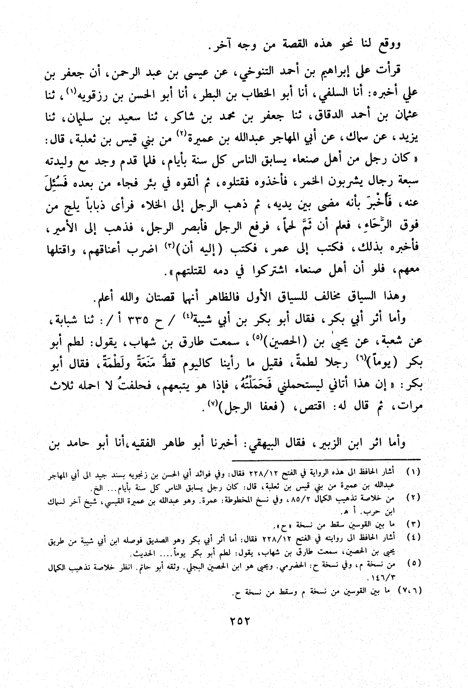 قَرَأت على إِبْرَاهِيمَ بْنِ أَحْمَدَ التَّنُوخِيِّ عَنْ عِيسَى بْنِ عَبْدِ الرَّحْمَنِ أَنَّ جَعْفَرَ بْنَ عَلِيٍّ أَخْبَرَهُ أَنا السِّلَفِيِّ أَنا أَبُو الْخَطَّابِ بْنُ الْبَطَرِ أَنا أَبُو الْحَسَنِ بْنُ رِزْقَوَيْهِ ثَنَا عُثْمَانُ بْنُ أَحْمَدَ الدَّقَّاقُ ثَنَا جَعْفَرُ بْنُ مُحَمَّدِ بْنِ شَاكِرٍ ثَنَا سَعِيدُ بْنُ سُلَيْمَانَ ثَنَا يَزِيدُ عَنْ سِمَاكٍ عَنْ أَبِي الْمُهَاجِرِ عَبْدِ اللَّهِ بْنِ عُمَيْرَةَ مِنْ بَنِي قَيْسِ بْنِ ثَعْلَبَةَ قَالَ كَانَ رَجُلٍ مِنْ أَهْلِ صَنْعَاءَ يُسَابِقُ النَّاسَ كُلَّ سَنَةٍ بِأَيَّامٍ فَلَمَّا قَدِمَ وَجَدَ مَعَ وَلِيدَتِهِ سَبْعَةَ رَجُلٍ يَشْرَبُونَ الْخَمْرَ فَأَخَذُوهُ فَقَتَلُوهُ ثُمَّ أَلْقَوْهُ فِي بِئْرٍ فَجَاءَ مَنْ بَعْدَهُ فَسُئِلَ عَنْهُ فَأُخْبِرَ بِأَنَّهُ مَضَى بَيْنَ يَدَيْهِ ثُمَّ ذَهَبَ الرَّجُلُ إِلَى الْخَلاءِ فَرَأَى ذُبَابًا يَلِجُ مِنْ فَوْقِ الرَّحَاءِ فَعَلِمَ أَنَّ ثَمَّ لَحْمًا فَرَفَعَ الرَّجُلُ فَأَبْصَرَ الرَّجُلَ فَذَهَبَ إِلَى الأَمِيرِ فَأَخْبَرَهُ بِذَلِكَ فَكَتَبَ إِلَى عُمَرَ فَكَتَبَ إِلَيْهِ أَنِ اضْرِبْ أَعْنَاقَهُمْ وَاقْتُلْهَا مَعَهُمْ فَلَوْ أَنَّ أَهْلَ صَنْعَاءَ اشْتَرَكُوا فِي دَمِهِ لَقَتَلْتُهُمْ