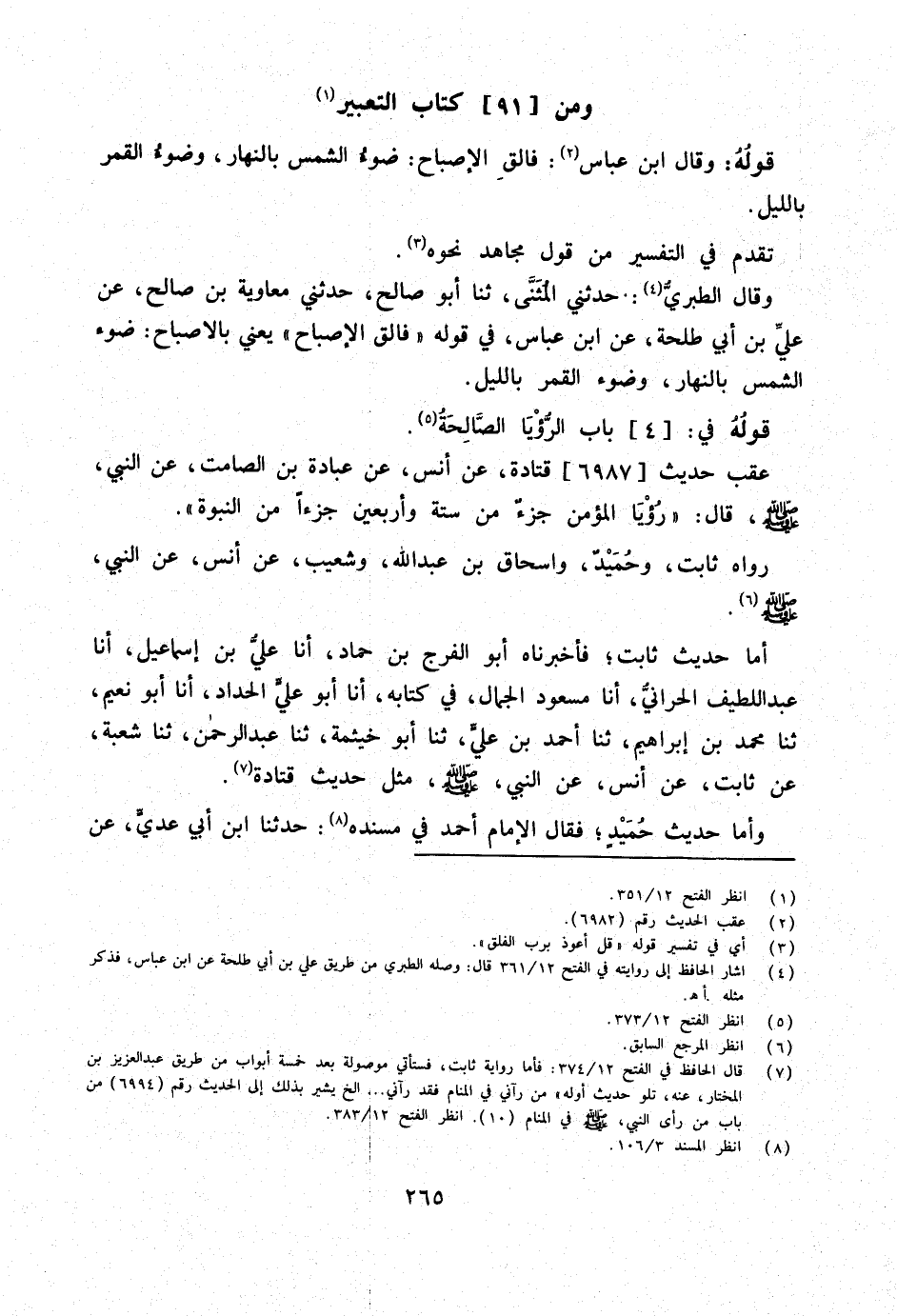 وَقَالَ الطَّبَرِيّ حَدَّثَنِي الْمُثَنَّى ثَنَا أَبُو صَالِحٍ حَدَّثَني مُعَاوِيَةُ بْنُ صَالِحٍ عَنْ عَلِيِّ بْنِ أَبِي طَلْحَةَ عَنِ ابْن عَبَّاس فِي قَوْله فَالِقُ الإصباح يَعْنِي بالإصباح ضوء الشَّمْس بِالنَّهَارِ وضوء الْقَمَر بِاللَّيْلِ