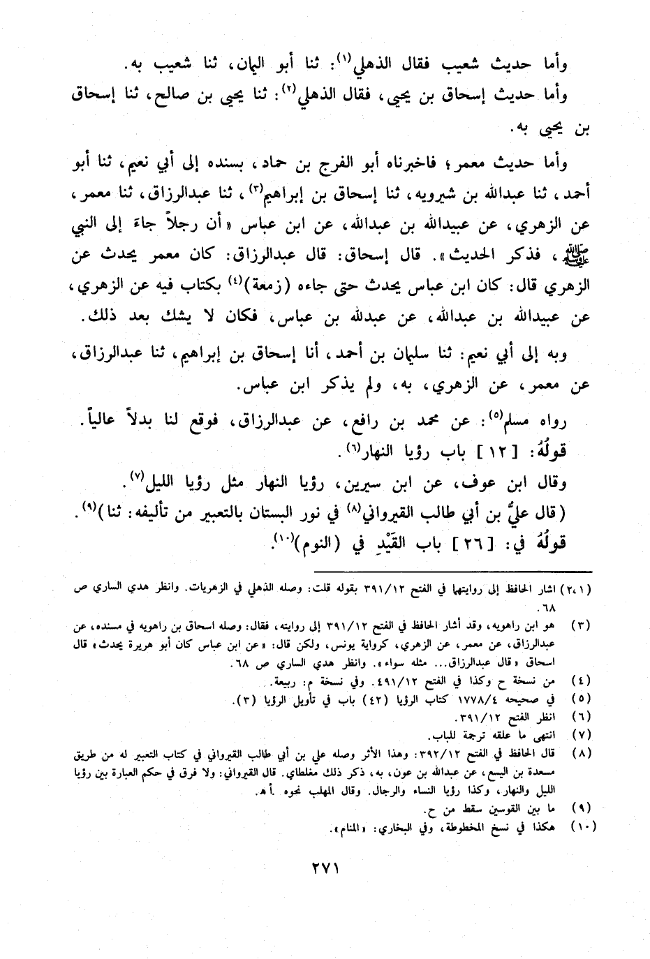 وَأما حَدِيث معمر فَأَخْبَرنَاهُ أَبُو الْفرج بن حَمَّاد بِسَنَدِهِ إِلَى أبي نعيم ثَنَا أَبُو أَحْمَدَ ثَنَا عَبْدُ اللَّهِ بن شيرويه ثَنَا إِسْحَاق بن إِبْرَاهِيم ثَنَا عبد الرَّزَّاق ثَنَا معمر عَن الزُّهْرِيّ عَن عبيد الله بن عبد الله عَن ابْن عَبَّاس أَن رجلا جَاءَ إِلَى النَّبِي صلى الله عَلَيْهِ وَسلم فَذكر الحَدِيث قَالَ إِسْحَاق قَالَ عبد الرَّزَّاق كَانَ معمر يحدث عَن الزُّهْرِيّ قَالَ كَانَ ابْن عَبَّاس يحدث حَتَّى جَاءَهُ زَمعَة بِكِتَاب فِيهِ عَن الزُّهْرِيّ عَن عبيد الله بْنُ عَبْدِ اللَّهِ عَنْ عَبْدِ الله بن عَبَّاس فَكَانَ لَا يشك بعد ذَلِك