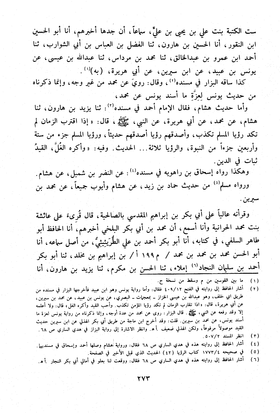 وَقَرَأْتُهُ عَالِيًا عَلَى أَبِي بَكْرِ بْنِ إِبْرَاهِيمَ الْمَقْدِسِيِّ بِالصَّالِحِيَّةِ قَالَ قُرِئَ عَلَى عَائِشَةَ بِنْتِ مُحَمَّدٍ الْحَرَّانِيَّةِ وَأَنَا أَسْمَعُ أَنَّ مُحَمَّدَ بْنَ أَبِي بَكْرٍ الْبَلْخِي أَخْبَرَهُمْ أَنا الْحَافِظُ أَبُو طَاهِرٍ السِّلَفِيُّ فِي كِتَابِهِ أَنا أَبُو بَكْرٍ أَحْمَدُ بْنُ عَلِيٍّ الطُّرَيْثِيثِيُّ مِنْ أَصْلِ سَمَاعِهِ أَنا أَبُو الْحسن مُحَمَّد بن مُحَمَّد بن مُحَمَّد م 199 أبْنِ إِبْرَاهِيمَ بْنِ مَخْلَدٍ ثَنَا أَبُو بكر أَحْمد بن سُلَيْمَان النَّجَّادُ إِمْلاءً ثَنَا الْحَسَنُ بْنُ مُكْرَمٍ ثَنَا يَزِيدُ بْنُ هَارُونَ أَنا