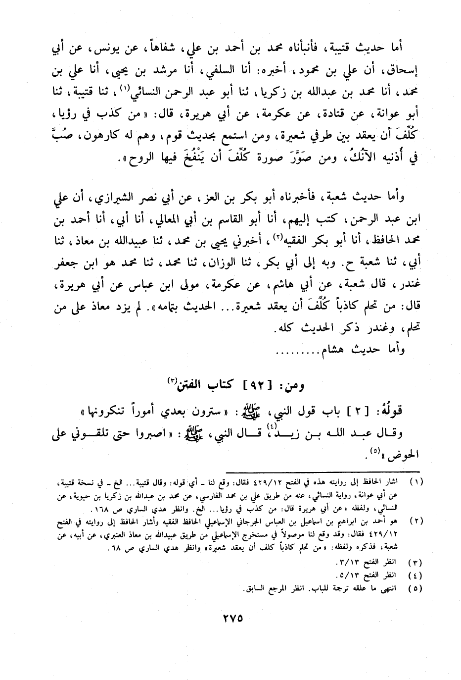 أما حَدِيث قُتَيْبَة فأنبأناه مُحَمَّد بن أَحْمد بن عَليّ شفاها عَن يُونُس عَن أبي إِسْحَاق أَن عَليّ بن مَحْمُود أخبرهُ أَنا السلَفِي أَنا مرشد بن يَحْيَى أَنا عَلِيُّ بْنُ مُحَمَّدٍ أَنا مُحَمَّد بن عبد الله بن زَكَرِيَّا ثَنَا أَبُو عبد الرَّحْمَن النَّسَائِيّ ثَنَا قُتَيْبَة ثَنَا أَبُو عَوَانَةَ عَنْ قَتَادَةَ عَنْ عِكْرِمَة عَن أبي هُرَيْرَة قَالَ من كذب فِي رُؤْيا كلف أَن يعْقد بَين طرفِي شعيرَة وَمن اسْتمع بِحَدِيث قوم وهم لَهُ كَارِهُون صب فِي أُذُنَيْهِ الآنك وَمن صور صُورَة كلف أَن ينْفخ فِيهَا روح