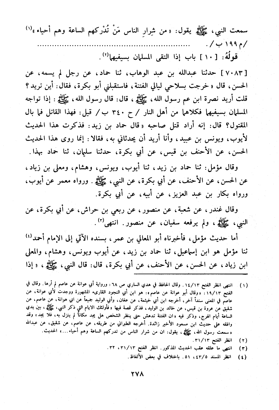 7083 - حَدَّثَنَا عَبْدُ اللَّهِ بْنُ عَبْدِ الْوَهَّابِ ثَنَا حَمَّادٌ عَنْ رَجُلٍ لَمْ يُسَمِّهِ عَنِ الْحَسَنِ قَالَ خَرَجْتُ بِسِلاحِي لَيَالِي الْفِتْنَةِ فَاسْتَقْبَلَنِي أَبُو بَكْرَةَ فَقَالَ أَيْنَ تُرِيدُ قُلْتُ أُرِيدُ نُصْرَةَ ابْنِ عَمُّ رَسُولِ اللَّهِ صَلَّى اللَّهُ عَلَيْهِ وَسَلَّمَ قَالَ قَالَ رَسُولُ الله صلى الله عَلَيْهِ وَسلم إِذَا تَوَاجَهَ الْمُسْلِمَانِ بِسَيْفَيْهِمَا فَكِلاهُمَا من أهل النَّار ح 340 ب قِيلَ فَهَذَا الْقَاتِلُ فَمَا بَالُ الْمَقْتُولِ قَالَ إِنَّهُ أَرَادَ قَتْلَ صَاحِبِهِ قَالَ حَمَّاد بن زيد فَذكرت هَذَا الحَدِيث لأيوب وَيُونُس بن عبيد وَأَنا أُرِيد أَن يحدثاني بِهِ فَقَالَا إِنَّمَا روى هَذَا الحَدِيث الْحسن عَن الْأَحْنَف بن قيس عَن أبي بكرَة حَدثنَا سُلَيْمَان ثَنَا حَمَّاد بِهَذَا