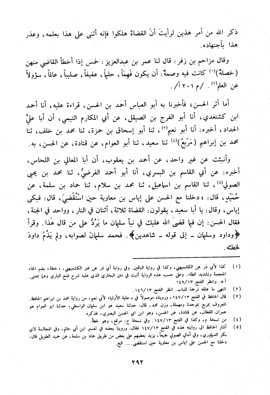 وأنبئت عَن غير وَاحِد عَن أَحْمد بن يَعْقُوب أَن أَبَا الْمَعَالِي بن اللحاس أخبرهُ عَن أبي الْقَاسِم بن البسري أَنا أَبُو أَحْمد الفرضي ثَنَا مُحَمَّد بن يحيى الصولي ثَنَا الْقَاسِم بن إِسْمَاعِيل ثَنَا مُحَمَّد بن سَلام ثَنَا حَمَّاد بن سَلمَة عَن حميد قَالَ دَخَلنَا مَعَ الْحسن على إِيَاس بن مُعَاوِيَة حِين استقضي قَالَ فَبكى إِيَاس وَقَالَ يَا أَبَا سعيد يَقُولُونَ الْقُضَاة ثَلَاثَة اثْنَان فِي النَّار وَوَاحِد فِي الْجنَّة فَقَالَ الْحسن إِن فِيمَا قضى الله عَلَيْك فِي نبأ سُلَيْمَان مَا يرد على من قَالَ هَذَا وَقَرَأَ {وَدَاوُد وَسليمَان} إِلَى قَوْله {شَاهِدين} فَحَمدَ سُلَيْمَان لصوابه وَلم يذم دَاوُد