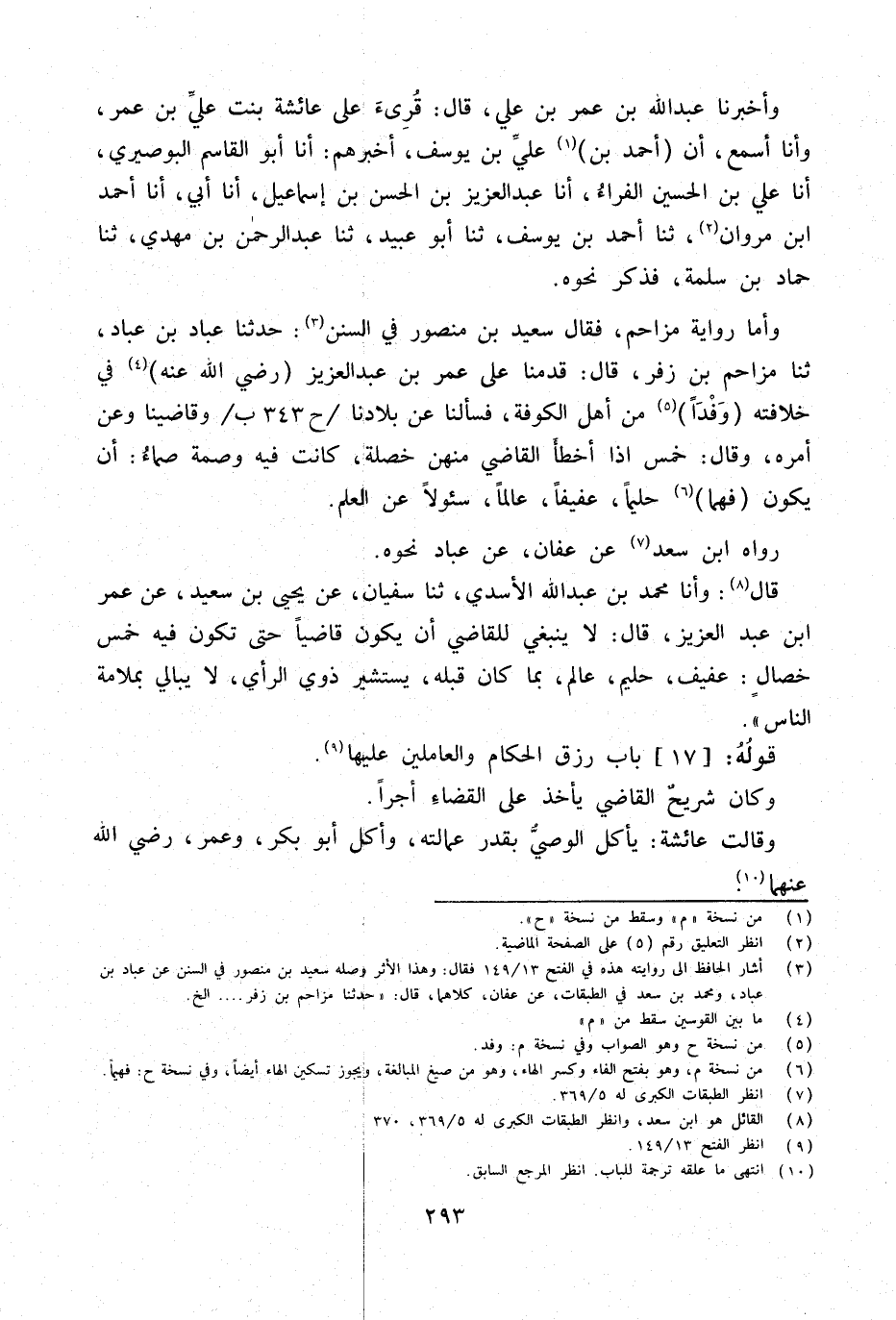 وَأما رِوَايَة مُزَاحم فَقَالَ سعيد بن مَنْصُور فِي السّنَن حَدَّثنا عَبَّادٌ بن عباد ثَنَا مُزَاحم بن زفر قَالَ قدمنَا على عمر بن عبد الْعَزِيز رَضِي الله عَنهُ فِي خِلَافَته وَفْدًا من أهل الْكُوفَة فسألنا عَن بِلَادنَا ح 343 ب وقاضينا وَعَن أمره وَقَالَ خمس إِذا أَخطَأ القَاضِي مِنْهُنَّ خصْلَة كَانَت فِيهِ وصمة صماء أَن يكون فهما حَلِيمًا عفيفا عَالما سئولا عَن الْعلم