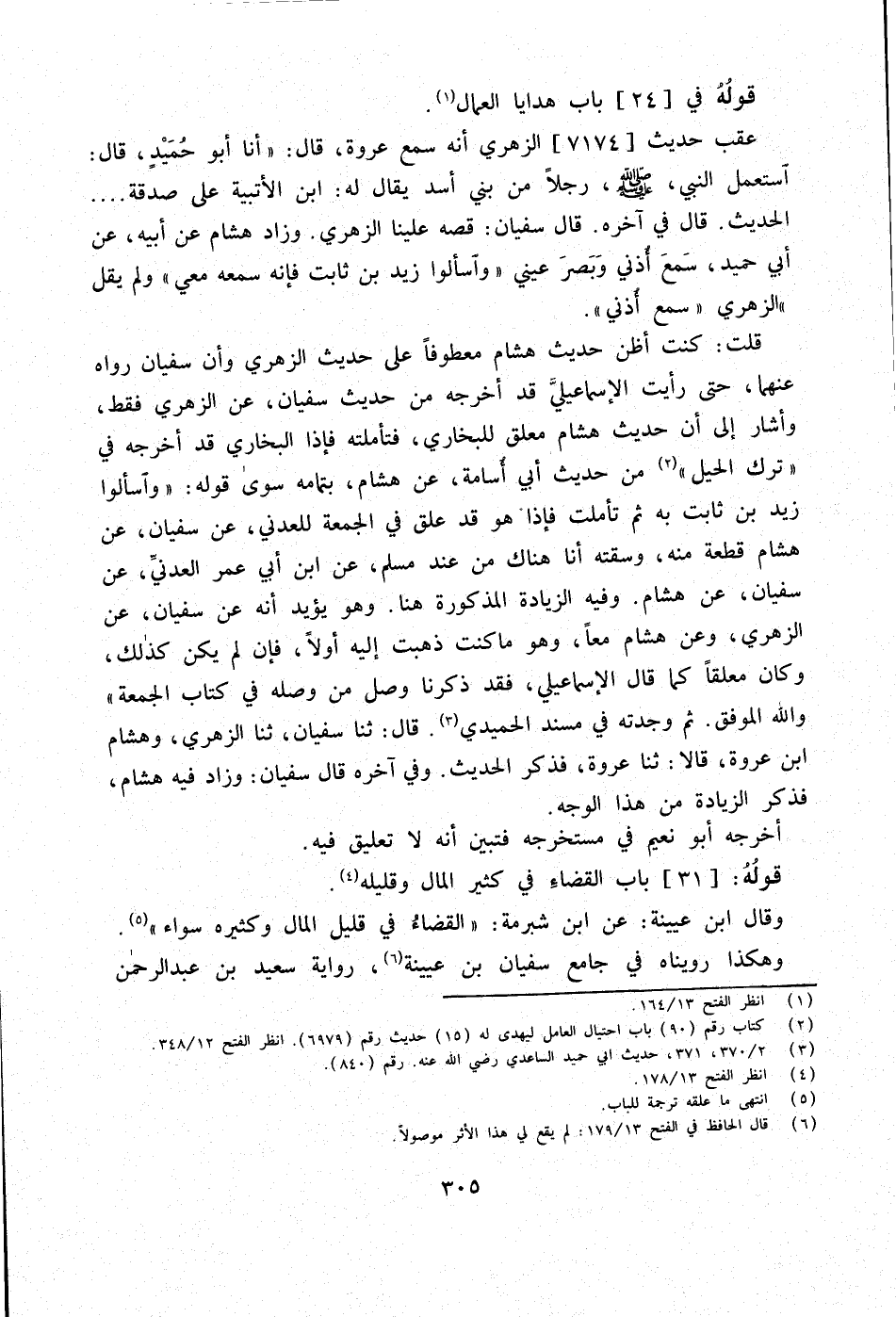 قلت كنت أَظن حَدِيث هِشَام مَعْطُوفًا على حَدِيث الزُّهْرِيّ وَأَن سُفْيَان رَوَاهُ عَنْهُمَا حَتَّى رَأَيْت الْإِسْمَاعِيلِيّ قد أخرجه من حَدِيث سُفْيَان عَن الزُّهْرِيّ فَقَط وَأَشَارَ إِلَى أَن حَدِيث هِشَام مُعَلّق للْبُخَارِيّ فتأملته فَإِذا البُخَارِيّ قد أخرجه فِي ترك الْحِيَل من حَدِيث أبي أُسَامَة عَن هِشَام بِتَمَامِهِ سوى قَوْله واسألوا زيد بن ثَابت بِهِ ثمَّ تَأَمَّلت فَإِذا هُوَ قد علق فِي الْجُمُعَة للعدني عَن سُفْيَان عَن هِشَام قِطْعَة مِنْهُ وسقته أَنا هُنَاكَ من عِنْد مُسلم عَن ابْن أبي عمر الْعَدنِي عَن سُفْيَان عَن هِشَام وَفِيه الزِّيَادَة الْمَذْكُورَة هُنَا وَهُوَ يُؤَيّد أَنه عَن سُفْيَان عَن الزُّهْرِيّ وَعَن هِشَام مَعًا وَهُوَ مَا كنت ذهبت إِلَيْهِ أَولا فَإِن لم يكن كَذَلِك وَكَانَ مُعَلّقا كَمَا قَالَ الْإِسْمَاعِيلِيّ فقد ذكرنَا وصل من وَصله فِي كتاب الْجُمُعَة وَالله الْمُوفق ثمَّ وجدته فِي مُسْند الْحميدِي قَالَ ثَنَا سُفْيَان ثَنَا الزُّهْرِيّ وَهِشَام ابْن عُرْوَة قَالَا ثَنَا عُرْوَة فَذكر الحَدِيث وَفِي آخِره قَالَ سُفْيَان وَزَاد فِيهِ هِشَام فَذكر الزِّيَادَة من هَذَا الْوَجْه