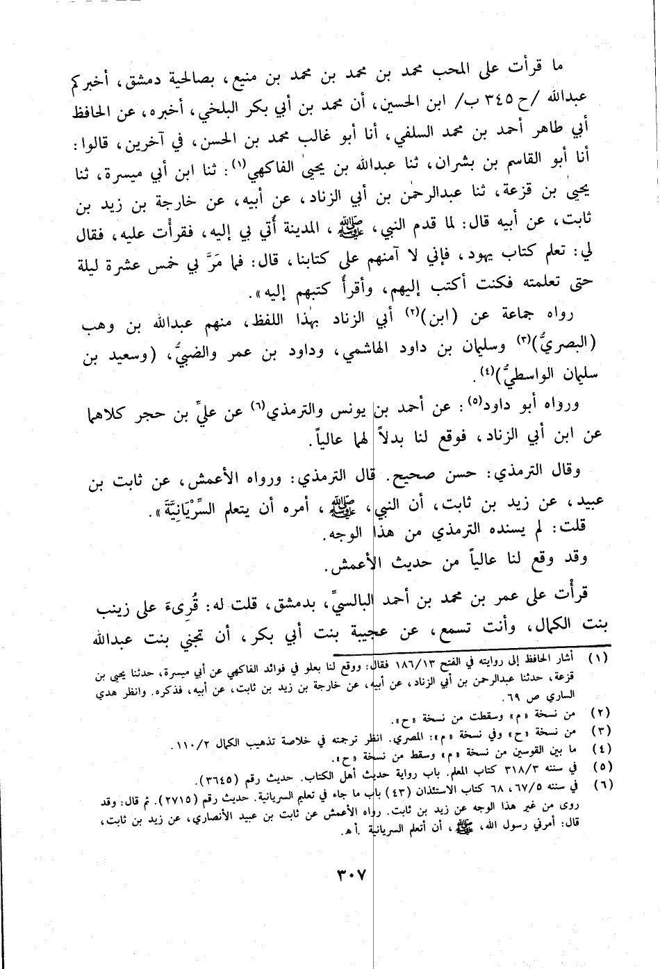 مَا قَرَأْتُ عَلَى الْمُحِبِّ مُحَمَّدِ بن مُحَمَّد بن مُحَمَّد بن مَنِيعٍ بِصَالِحِيَّةِ دِمَشْقَ أَخْبَرَكُمْ عَبْدُ الله ح 345 ب ابْن الْحُسَيْنِ أَنَّ مُحَمَّدَ بْنَ أَبِي بَكْرٍ الْبَلْخِيَّ أَخْبَرَهُ عَنِ الْحَافِظِ أبي طَاهِر أَحْمد بن مُحَمَّد السِّلَفِيِّ أَنا أَبُو غَالِبٍ مُحَمَّدُ بْنُ الْحَسَنِ فِي آخَرِينَ قَالُوا أَنا أَبُو الْقَاسِم بن بَشرَان ثَنَا عبد الله بن يحيى الْفَاكِهِيُّ ثَنَا ابْنُ أَبِي مَيْسَرَةَ ثَنَا يَحْيَى بْنُ قَزَعَةَ ثَنَا عَبْدُ الرَّحْمَنِ بْنُ أَبِي الزِّنَادِ عَنْ أَبِيهِ عَنْ خَارِجَةَ بْنِ زَيْدِ بْنِ ثَابِتٍ عَنْ أَبِيهِ قَالَ لَمَّا قَدِمَ النَّبِيُّ صَلَّى اللَّهُ عَلَيْهِ وَسَلَّمَ الْمَدِينَةَ أُتِيَ بِي إِلَيْهِ فَقَرَأْتُ عَلَيْهِ فَقَالَ لِي تَعَلَّمْ كِتَابَ يَهُودَ فَإِنِّي لَا آمَنُهُمْ عَلَى كِتَابِنَا قَالَ فَمَا مَرَّ بِي خَمْسَ عَشْرَةَ لَيْلَةً حَتَّى تَعَلَّمْتُهُ فَكُنْتُ أَكْتُبُ إِلَيْهِمْ وَأَقْرَأُ كُتُبَهُمْ إِلَيْهِ