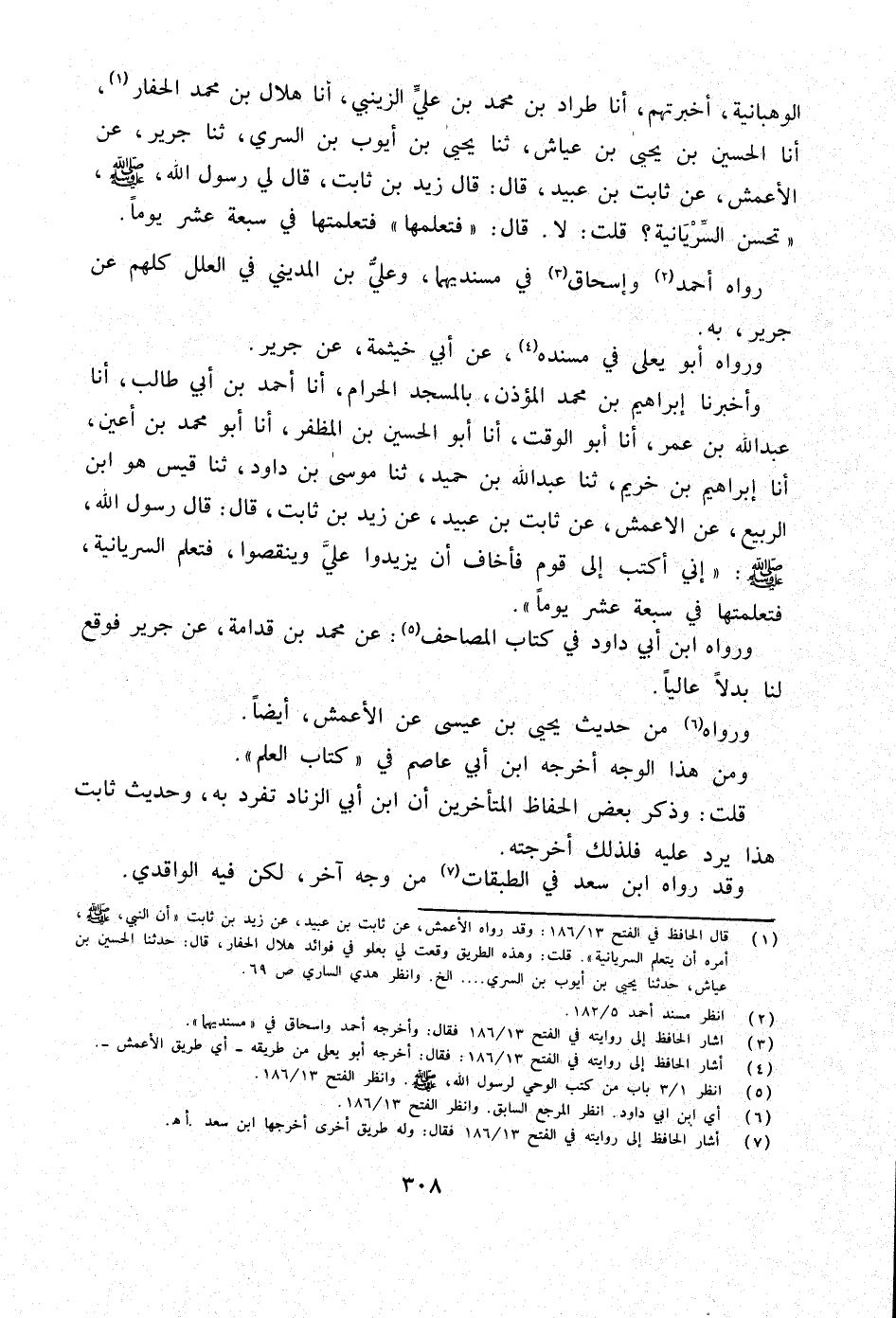 الْوَهْبَانِيَّةَ أَخْبَرَتْهُمْ أَنا طِرَادُ بْنُ مُحَمَّدِ بْنِ عَلِيٍّ الزَّيْنَبِيِّ أَنا هِلالُ بْنُ مُحَمَّدٍ الْحَفَّارُ أَنا الْحُسَيْنُ بْنُ يَحْيَى بْنِ عَيَّاشٍ ثَنَا يَحْيَى بْنُ أَيُّوبَ بْنِ السَّرِيِّ ثَنَا جَرِيرٌ عَنِ الأَعْمَشِ عَنْ ثَابِتِ بْنِ عُبَيْدٍ قَالَ قَالَ زَيْدُ بْنُ ثَابِتٍ قَالَ لِي رَسُولُ اللَّهِ صَلَّى اللَّهُ عَلَيْهِ وَسَلَّمَ تُحْسِنُ السُّرْيَانِيَّةَ قُلْتُ لَا قَالَ فتعلمتها فِي سَبْعَة عشرَة يَوْمًا