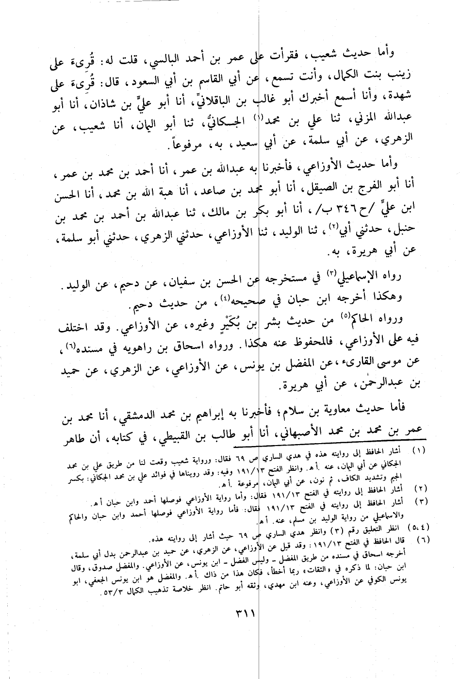 وَأما حَدِيث شُعَيْب فَقَرَأت على عمر بن أَحْمد البالسي قلت لَهُ قُرِئَ عَلَى زَيْنَبَ بِنْتِ الْكَمَال وَأَنت تسمع عَن أبي الْقَاسِم بن أبي السُّعُود قَالَ قُرِئَ عَلَى شُهْدَةَ وَأنا أَسْمَعُ أخْبرك أَبُو غَالب بن الباقلاني أَنا أَبُو عَليّ بن شَاذان أَنا أَبُو عبد الله الْمُزنِيّ ثَنَا عَليّ بن مُحَمَّد الجكاني ثَنَا أَبُو الْيَمَانِ أَنا شُعَيْبٌ عَنِ الزُّهْرِيِّ عَنْ أَبِي سَلَمَةَ عَن أبي سعيد بِهِ مَرْفُوعا