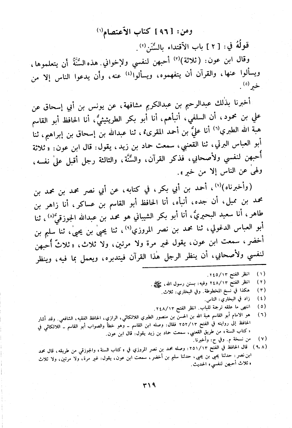 أَخْبَرَنَا بذلك عبد الرَّحِيم بن عَبْدِ الْكَرِيمِ مُشَافَهَةً عَنْ يُونُسَ بن أبي إِسْحَاق عَن عَليّ بن مَحْمُود أَن السلَفِي أنبأهم أَنا أَبُو بكر الطريثيثي أَنا الْحَافِظ أَبُو الْقَاسِم هبة الله الطَّبَرِيّ أَنا عَليّ بن أَحْمد الْمُقْرِئ ثَنَا عبد الله بن إِسْحَاقُ بْنُ إِبْرَاهِيمَ ثَنَا أَبُو الْعَبَّاس البرتي ثَنَا القعْنبِي سَمِعت حَمَّاد بن زيد يَقُول قَالَ ابْن عون ثَلَاثَة أحبهنَّ لنَفْسي ولأصحابي فَذكر الْقُرْآن وَالسّنة وَالثَّالِثَة رجل أقبل على نَفسه ولهى عَن النَّاس إِلَّا من خير