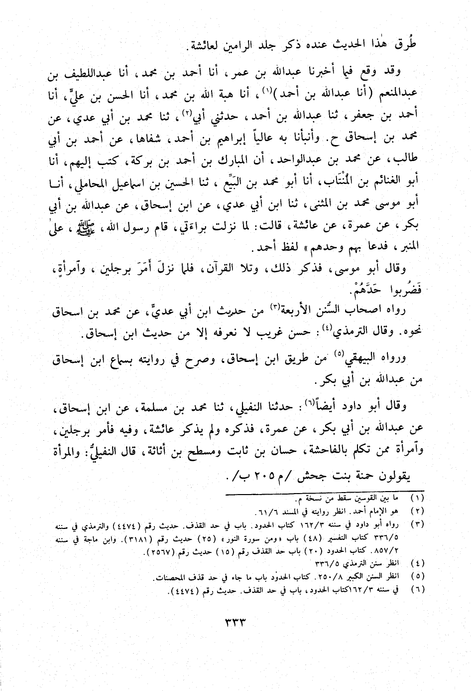 وَقَالَ أَبُو دَاوُد أَيْضا حَدثنَا النُّفَيْلِي ثَنَا مُحَمَّدُ بْنُ سَلَمَةَ عَنْ ابْنِ إِسْحَاقَ عَنْ عَبْدِ اللَّهِ بْنِ أَبِي بَكْرٍ عَنْ عَمْرَةَ فَذكره وَلم يذكر عَائِشَة وَفِيه فَأمر برجلَيْن وَامْرَأَة مِمَّن تكلم بالفاحشة حسان بن ثَابت ومسطح بن أَثَاثَة قَالَ النُّفَيْلِي وَالْمَرْأَة يَقُولُونَ حمْنَة بنت جحش م 205 ب