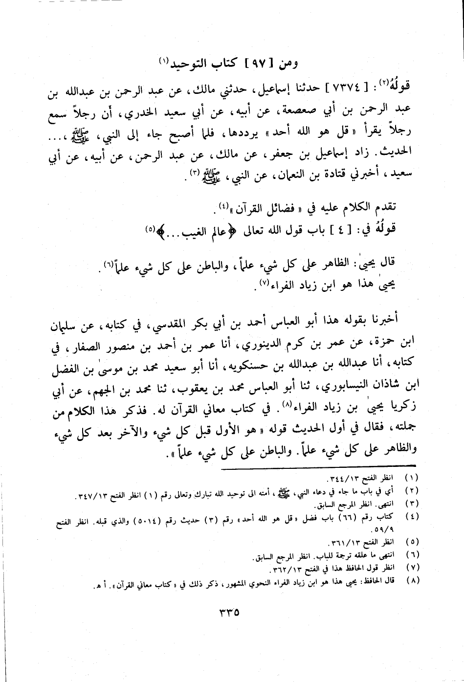 أخبرنَا بقوله هَذَا أَبُو الْعَبَّاس أَحْمد بن أَبِي بَكْرٍ الْمَقْدِسِيُّ فِي كِتَابِهِ عَن سُلَيْمَان ابْن حَمْزَة عَن عمر بن كرم الدينَوَرِي أَنا عمر بن أَحْمد بن مَنْصُور الصفار فِي كِتَابه أَنا عَبْدُ اللَّهِ بْنُ عَبْدِ الله بن حسنكويه أَنا أَبُو سعيد مُحَمَّد بن مُوسَى بن الْفضل ابْن شَاذان النَّيْسَابُورِي ثَنَا أَبُو الْعَبَّاس مُحَمَّد بن يَعْقُوب ثَنَا مُحَمَّد بن الجهم عَن أبي زَكَرِيَّا يحيى بن زِيَاد الْفراء فِي كتاب مَعَاني الْقُرْآن لَهُ فَذكر هَذَا الْكَلَام من جملَته فَقَالَ فِي أول الحَدِيث قَوْله هُوَ الأول قبل كل شَيْء والأخر بعد كل شَيْء وَالظَّاهِر على كل شَيْء علما وَالْبَاطِن على كل شَيْء علما