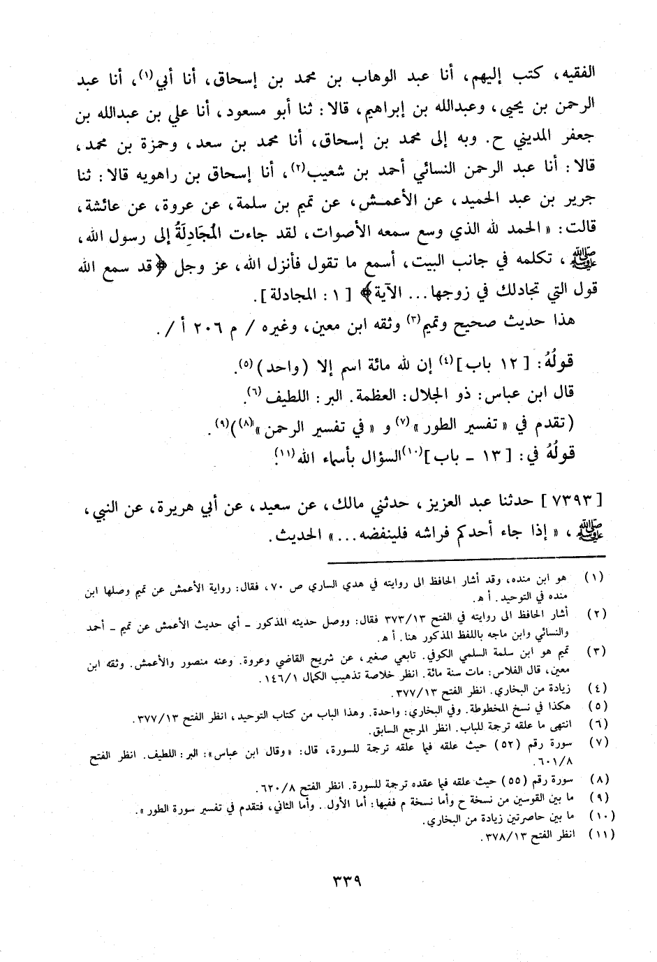 الْفَقِيهَ كَتَبَ إِلَيْهِمْ أَنا عَبْدُ الْوَهَّاب بن مُحَمَّد بن إِسْحَاق أَنا أبي أَنا عبد الرَّحْمَن بْنُ يَحْيَى وَعَبْدُ اللَّهِ بْنُ إِبْرَاهِيمَ قَالا ثَنَا أَبُو مَسْعُودٍ أَنا عَلِيُّ بْنُ عَبْدِ اللَّهِ بْنِ جَعْفَرٍ الْمَدِينِيُّ ح وَبِهِ إِلَى مُحَمَّدِ بْنِ إِسْحَاقَ أَنا مُحَمَّدُ بْنُ سَعْدٍ وَحَمْزَةُ بْنُ مُحَمَّدٍ قَالا أَنا عَبْدُ الرَّحْمَنِ النَّسَائِيُّ أَحْمَدُ بْنُ شُعَيْبٍ أَنا إِسْحَاقُ بْنُ رَاهَوَيْهِ قَالا ثَنَا جَرِيرُ بْنُ عَبْدِ الْحَمِيدِ عَنْ الأَعْمَشِ عَنْ تَمِيمِ بْنِ سَلَمَةَ عَنْ عُرْوَةَ عَنْ عَائِشَةَ قَالَتْ الحمدلله الَّذِي وَسِعَ سَمْعُهُ الأَصْوَاتَ لَقَدْ جَاءَتِ الْمُجَادِلَةُ إِلَى رَسُولِ اللَّهِ صَلَّى اللَّهُ عَلَيْهِ وَسَلَّمَ تُكَلِّمُهُ فِي جَانِبِ الْبَيْتِ أَسْمَعُ مَا تَقُولُ فَأَنْزَلَ اللَّهُ عَزَّ وَجَلَّ {قَدْ سَمِعَ اللَّهُ قَوْلَ الَّتِي تُجَادِلك فِي زَوجهَا} الْآيَة 1 المجادلة