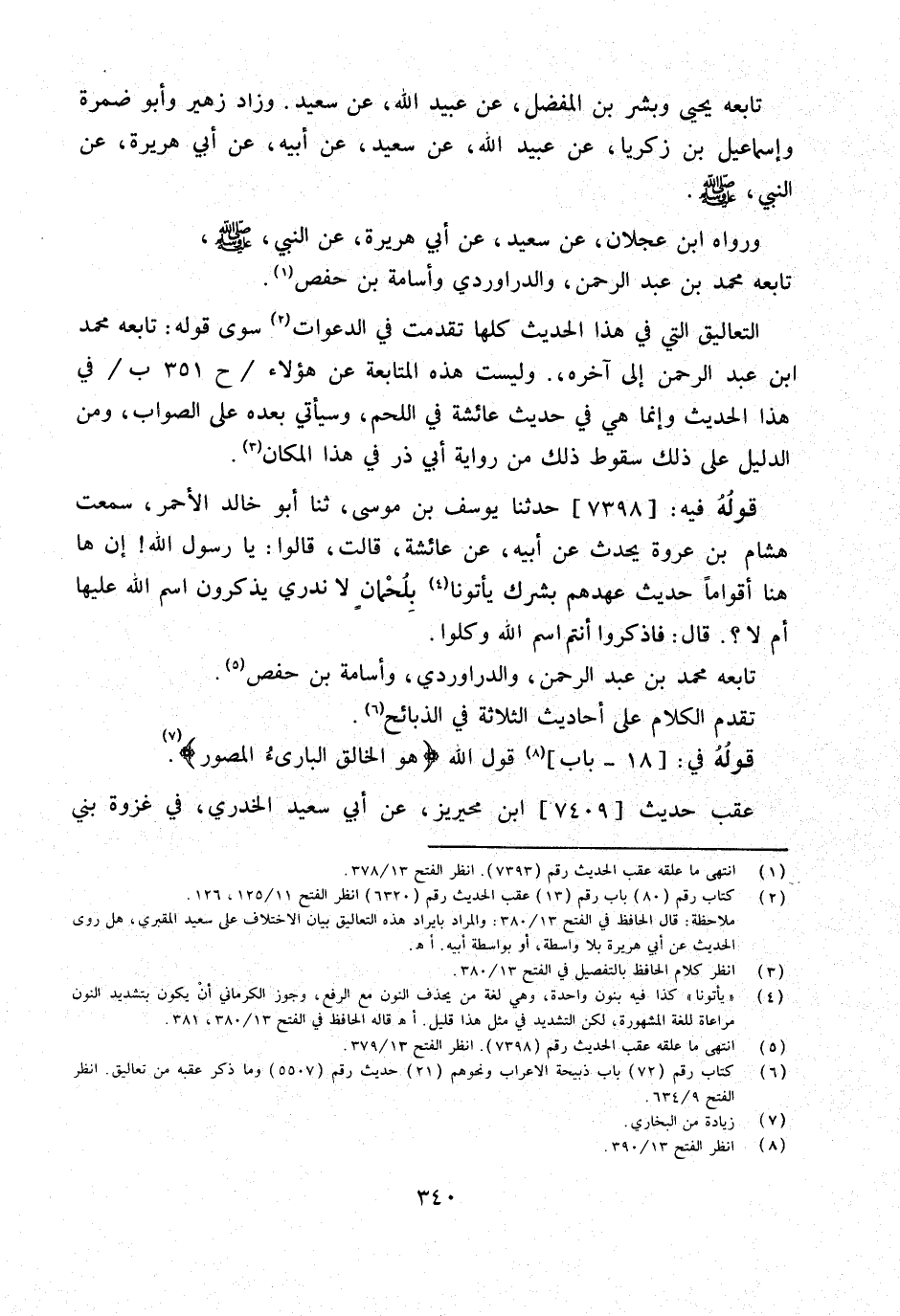 التَّعَالِيق الَّتِي فِي هَذَا الحَدِيث كلهَا تقدّمت فِي الدَّعْوَات سوى قَوْله تَابعه مُحَمَّد ابْن عبد الرَّحْمَن إِلَى آخِره وَلَيْسَت هَذِه الْمُتَابَعَة عَن هَؤُلَاءِ ح 351 ب فِي هَذَا الحَدِيث وَإِنَّمَا هِيَ فِي حَدِيث عَائِشَة فِي اللَّحْم وَسَيَأْتِي بعده على الصَّوَاب وَمن الدَّلِيل على ذَلِك سُقُوط ذَلِك من رِوَايَة أبي ذَر فِي هَذَا الْمَكَان