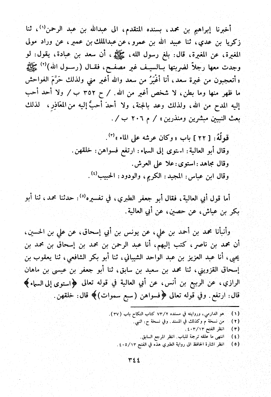 أَخْبَرَنَا إِبْرَاهِيمُ بْنُ مُحَمَّدٍ بِسَنَدِهِ الْمُتَقَدِّمِ إِلَى عَبْدِ اللَّهِ بْنِ عَبْدِ الرَّحْمَنِ ثَنَا زَكَرِيَّا بْنُ عدي ثَنَا عبيد الله بْنُ عَمْرٍو عَنْ عَبْدِ الْمَلِكِ بْنِ عُمَيْرٍ عَنْ وَرَّادٍ مَوْلَى الْمُغِيرَةِ عَنِ الْمُغِيرَةِ قَالَ بَلَغَ رَسُول الله صلى الله عَلَيْهِ وَسَلَّمَ أَنَّ سَعْدَ بْنَ عُبَادَةَ يَقُولُ لَوْ وَجَدْتُ مَعَهَا رَجُلا لَضَرَبْتُهَا بِالسَّيْفِ غَيْرُ مُصْفِحٍ فَقَالَ رَسُول الله صلى الله عَلَيْهِ وَسلم أتعجبون من غيرَة سعد أَنَا أَغْيَرُ مِنْ سَعْدٍ وَاللَّهُ أَغْيَرُ مِنِّي وَلِذَلِكَ حَرَّمَ الْفَوَاحِشَ مَا ظَهَرَ مِنْهَا وَمَا بَطَنَ لَا شخص أغير من الله ح 352 ب وَلا أَحَدَ أَحَبُّ إِلَيْهِ الْمَدْحُ مِنَ اللَّهِ وَلِذَلِكَ وَعَدَ بِالْجَنَّةِ وَلا أَحَدَ أَحَبُّ إِلَيْهِ مِنَ الْمَعَاذِرِ لِذَلِكَ بَعَثَ النَّبِيِّينَ مُبَشِّرِينَ ومنذرين م 206 ب