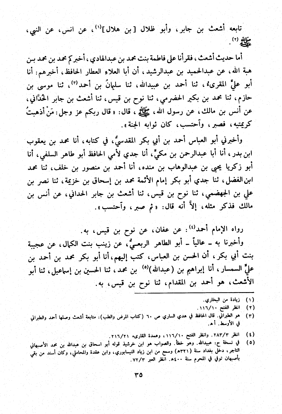أما حَدِيث أَشْعَث فَقَرَأْنَا عَلَى فَاطِمَةَ بِنْتِ مُحَمَّدِ بْنِ عَبْدِ الْهَادِي أَخْبَرَكُمْ مُحَمَّدُ بْنُ مُحَمَّدِ بْنِ هِبَةِ اللَّهِ عَنْ عَبْدِ الْحَمِيدِ بْنِ عَبْدِ الرَّشِيدِ أَنَّ أَبَا الْعَلاءِ الْعَطَّارَ الْحَافِظَ أَخْبَرَهُمْ أَنا أَبُو عَلِيٍّ الْمُقْرِئُ ثَنَا أَحْمد بن عبيد الله ثَنَا سُلَيْمَان بن أَحْمد ثَنَا مُوسَى بْنُ حَازِمٍ ثَنَا مُحَمَّدُ بْنُ بُكَيْرٍ الْحَضْرَمِيُّ ثَنَا نُوحُ بْنُ قَيْسٍ ثَنَا أَشْعَثُ بْنُ جَابِرٍ الْحُدَّانِيُّ عَنْ أَنَسِ بْنِ مَالِكٍ عَنْ رَسُولِ اللَّهِ صَلَّى اللَّهُ عَلَيْهِ وَسَلَّمَ قَالَ قَالَ رَبُّكُمْ عَزَّ وَجَلَّ مَنْ أَذْهَبْتُ كَرِيمَتَيْهِ فَصَبَرَ وَاحْتَسَبَ كَانَ ثَوَابُهُ الْجَنَّةَ