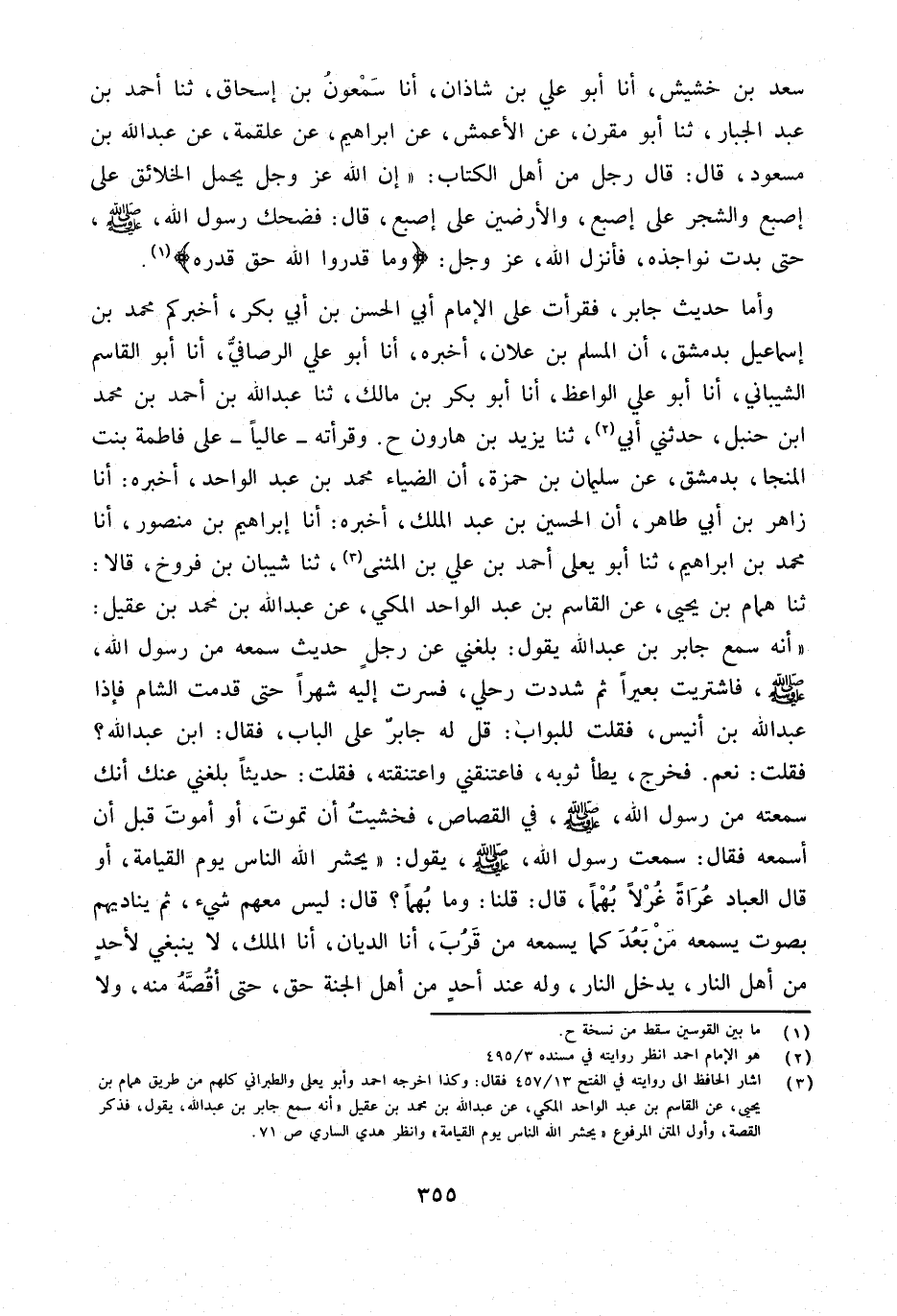 وَأما حَدِيث جَابر فَقَرَأْتُ عَلَى الإِمَامِ أَبِي الْحَسَنِ بْنِ أَبِي بَكْرٍ أَخْبَرَكُمْ مُحَمَّدُ بْنُ إِسْمَاعِيلَ بِدِمَشْقَ أَنَّ الْمُسْلِمَ بْنَ عَلانَ أَخْبَرَهُ أَنا أَبُو عَلِيٍّ الرَّصَافِيُّ أَنا أَبُو الْقَاسِمِ الشَّيْبَانِيُّ أَنا أَبُو عَليّ الْوَاعِظ أَنا أَبُو بَكْرِ بْنُ مَالِكٍ ثَنَا عَبْدُ الله بن أَحْمد بن مُحَمَّد ابْن حَنْبَلٍ حَدَّثَنِي أَبِي ثَنَا يَزِيدُ بْنُ هَارُونَ ح وَقَرَأْتُهُ عَالِيًا عَلَى فَاطِمَةَ بِنْتِ الْمُنَجَّا بِدِمَشْقَ عَن سُلَيْمَان بن حَمْزَة أَن الضياء مُحَمَّد بن عبد الْوَاحِد أَخْبَرَهُ أَنا زَاهِرُ بْنُ أَبِي طَاهِر أَن الْحُسَيْن بن عبد الْملك أخبرهُ أَنا إِبْرَاهِيم بن مَنْصُور أَنا مُحَمَّد بن إِبْرَاهِيم ثَنَا أَبُو يَعْلَى أَحْمَدُ بْنُ عَلِيِّ بْنِ الْمُثَنَّى ثَنَا شَيْبَانُ بْنُ فَرُّوخَ قَالا ثَنَا هَمَّامُ بْنُ يَحْيَى عَنِ الْقَاسِمِ بْنِ عَبْدِ الْوَاحِدِ الْمَكِّيِّ عَنْ عَبْدِ الله بن مُحَمَّد بن عقيل أَنَّهُ سَمِعَ جَابِرَ بْنَ عَبْدِ اللَّهِ يَقُولُ بَلَغَنِي عَنْ رَجُلٍ حَدِيثٌ سَمِعَهُ مِنْ رَسُولِ اللَّهِ صَلَّى اللَّهُ عَلَيْهِ وَسَلَّمَ فَاشْتَرَيْتُ بَعِيرًا ثُمَّ شَدَدْتُ رَحْلِي فَسِرْتُ إِلَيْهِ شَهْرًا حَتَّى قَدِمْتُ الشَّامَ فَإِذَا عَبْدُ اللَّهِ بْنُ أُنَيْسٍ فَقُلْتُ لِلْبَوَّابِ قُلْ لَهُ جَابِرٌ عَلَى الْباب فَقَالَ ابْنُ عَبْدِ اللَّهِ فَقُلْتُ نَعَمْ فَخَرَجَ يَطَأُ ثَوْبَهُ فَاعْتَنَقَنِي وَاعْتَنَقْتُهُ فَقُلْتُ حَدِيثًا بَلَغَنِي عَنْكَ أَنَّكَ سَمِعْتَهُ مِنْ رَسُول الله صلى الله عَلَيْهِ وَسَلَّمَ فِي الْقِصَاصِ فَخَشِيتُ أَنْ تَمُوتَ أَوْ أَمُوتَ قَبْلَ أَنْ أَسْمَعَهُ فَقَالَ سَمِعْتُ رَسُولَ اللَّهِ صَلَّى اللَّهُ عَلَيْهِ وَسَلَّمَ يَقُولُ يَحْشُرُ اللَّهُ النَّاسَ يَوْمَ الْقِيَامَةِ أَوْ قَالَ الْعِبَادَ عُرَاةً غُرْلا بُهْمًا قَالَ قُلْنَا وَمَا بُهْمًا قَالَ لَيْسَ مَعَهُمْ شَيْءٌ