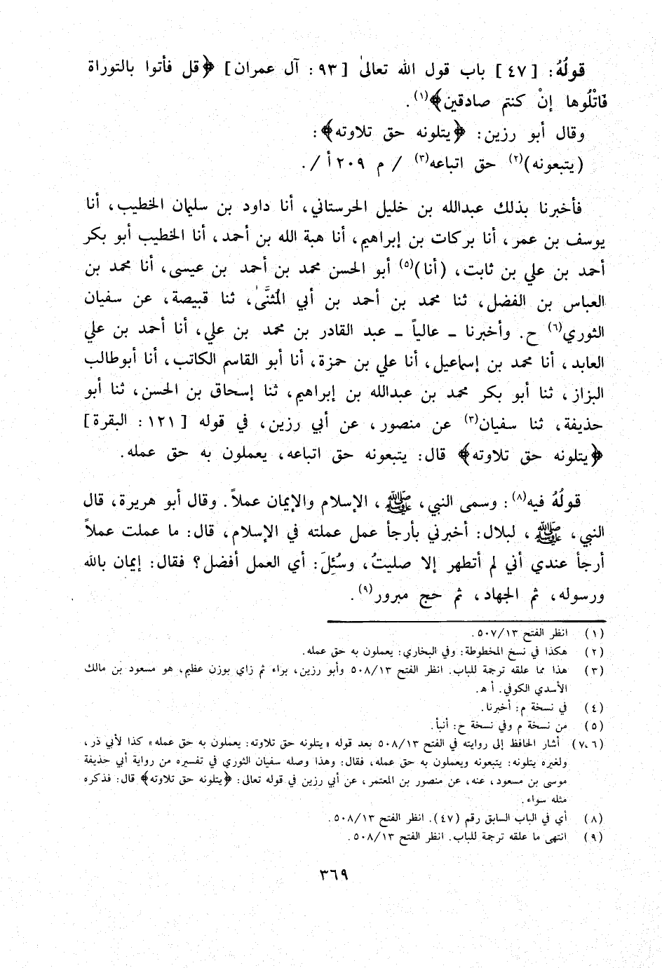 فَأَخْبَرَنَا بِذَلِكَ عَبْدُ اللَّهِ بْنُ خَلِيلٍ الْحَرَسْتَانِيُّ أَنا دَاوُدُ بْنُ سُلَيْمَانَ الْخَطِيبُ أَنا يُوسُفُ بْنُ عُمَرَ أَنا بَرَكَاتُ بْنُ إِبْرَاهِيمَ أَنا هبة الله بن أَحْمد أَنا الْخَطِيبُ أَبُو بَكْرٍ أَحْمَدُ بْنِ عَلِيِّ بْنِ ثَابِتٍ أَنا أَبُو الْحسن مُحَمَّد بن أَحْمد بْنِ عِيسَى أَنا مُحَمَّدُ بْنُ الْعَبَّاسِ بْنِ الْفَضْلِ ثَنَا مُحَمَّدُ بن أَحْمد بن أبي الْمثنى ثَنَا قَبِيصَةُ عَنْ سُفْيَانَ الثَّوْرِيِّ ح وَأَخْبَرَنَا عَالِيًا عَبْدُ الْقَادِرِ بن مُحَمَّد بن عَليّ أَنا أَحْمَدُ بْنُ عَلِيٍّ الْعَابِدُ أَنا مُحَمَّدُ بْنُ إِسْمَاعِيلَ أَنا عَلِيُّ بْنُ حَمْزَةَ أَنا أَبُو الْقَاسِمِ الْكَاتِبُ أَنا أَبُو طَالِبٍ الْبَزَّازُ ثَنَا أَبُو بكر مُحَمَّد بن عَبْدِ اللَّهِ بْنِ إِبْرَاهِيمَ ثَنَا إِسْحَاقُ بْنُ الْحَسَنِ ثَنَا أَبُو حُذَيْفَةَ ثَنَا سُفْيَانُ عَنْ مَنْصُورٍ عَنْ أَبِي رَزِينٍ فِي قَوْله 121 الْبَقَرَة {يتلونه حق تِلَاوَته} قَالَ يَتَّبِعُونَهُ حَقَّ اتِّبَاعِهِ يَعْمَلُونَ بِهِ حَقَّ عَمَلِهِ