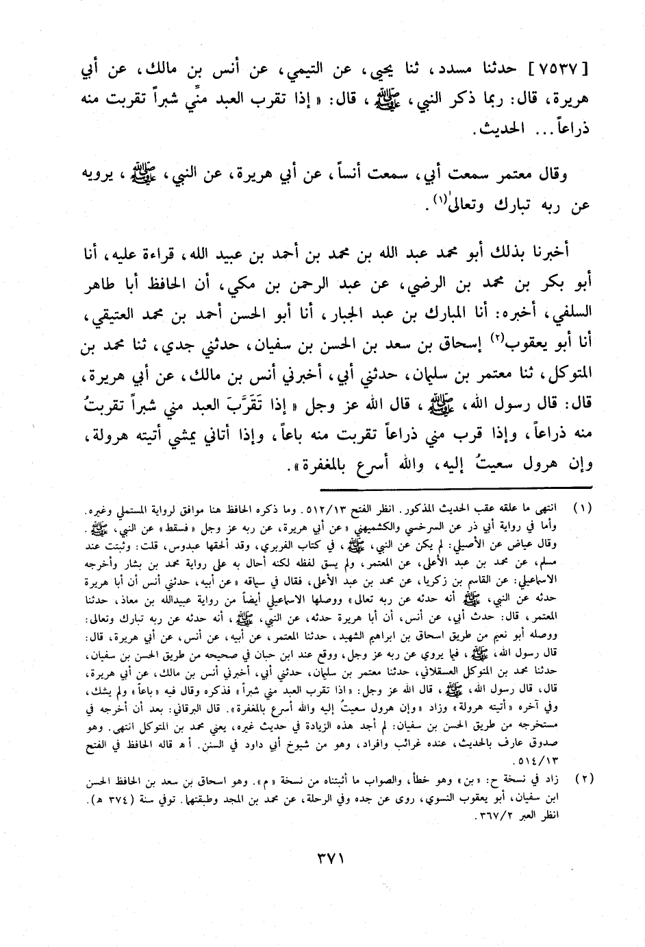 أَخْبَرَنَا بِذَلِكَ أَبُو مُحَمَّدٍ عبد الله بن مُحَمَّد بن أَحْمد بن عبيد الله قِرَاءَةً عَلَيْهِ أَنا أَبُو بَكْرِ بْنُ مُحَمَّدِ بْنِ الرَّضِيِّ عَنْ عبد الرَّحْمَن بن مكي أَن الْحَافِظَ أَبَا طَاهِرٍ السِّلَفِيَّ أَخْبَرَهُ أَنا الْمُبَارك بن عبد الْجَبَّار أَنا أَبُو الْحَسَنِ أَحْمَدُ بْنُ مُحَمَّدٍ الْعَتِيقِيُّ أَنا أَبُو يَعْقُوبَ إِسْحَاقُ بْنُ سَعْدِ بْنِ الْحَسَنِ بْنِ سُفْيَانَ حَدَّثَنِي جَدِّي ثَنَا مُحَمَّدُ بْنُ الْمُتَوَكِّلِ ثَنَا مُعْتَمِرُ بْنُ سُلَيْمَانَ حَدَّثَنِي أَبِي أَخْبَرَنِي أَنَسِ بْنِ مَالِكٍ عَنْ أَبِي هُرَيْرَة قَالَ قَالَ رَسُول الله صَلَّى اللَّهُ عَلَيْهِ وَسَلَّمَ قَالَ اللَّهُ عَزَّ وَجَلَّ إِذَا تَقَرَّبَ الْعَبْدُ مِنِّي شِبْرًا تَقَرَّبْتُ مِنْهُ ذِرَاعًا وَإِذَا قَرُبَ مِنِّي ذِرَاعًا تَقَرَّبْتُ مِنْهُ بَاعًا وَإِذَا أَتَانِي يَمْشِي أَتَيْتُهُ هَرْوَلَةً وَإِنْ هَرْوَلَ سَعَيْتُ إِلَيْهِ وَاللَّهُ أَسْرَعُ بِالْمَغْفِرَةُ