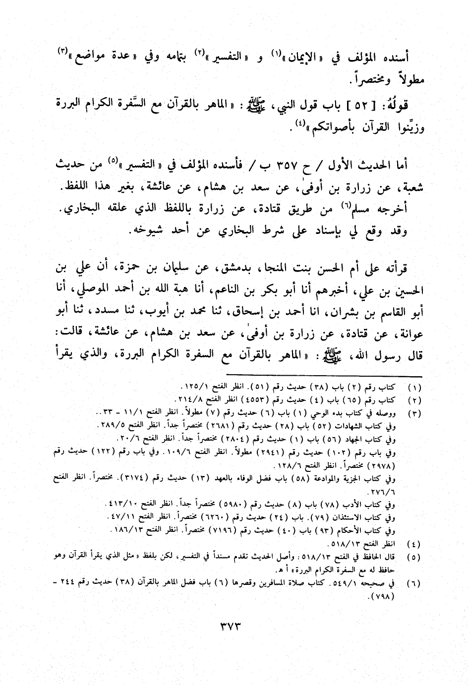 قَرَأْتُهُ عَلَى أُمِّ الْحَسَنِ بِنْتِ الْمُنَجَّا بِدِمَشْقَ عَنْ سُلَيَمْانَ بْنِ حَمْزَةَ أَنَّ عَلِيَّ بْنَ الْحُسَيْنِ بْنِ عَلِيٍّ أَخْبَرَهُمْ أَنا أَبُو بَكْرِ بْنُ النَّاعِمِ أَنا هبة الله بن أَحْمد الْموصِلِي أَنا أَبُو الْقَاسِم بن بَشرَان أَنا أَحْمد بن إِسْحَاق ثَنَا مُحَمَّدُ بْنُ أَيُّوبَ ثَنَا مُسَدَّدٌ ثَنَا أَبُو عَوَانَةَ عَنْ قَتَادَةَ عَن زُرَارَة بن أوفى عَن سَعْدِ بْنِ هِشَامٍ عَنْ عَائِشَةَ قَالَتْ قَالَ رَسُولُ اللَّهِ صَلَّى الله عَلَيْهِ وَسَلَّمَ الماهر بِالْقُرْآنِ مَعَ السَّفَرَةِ الْكِرَامِ الْبَرَرَةِ وَالَّذِي يقْرَأ