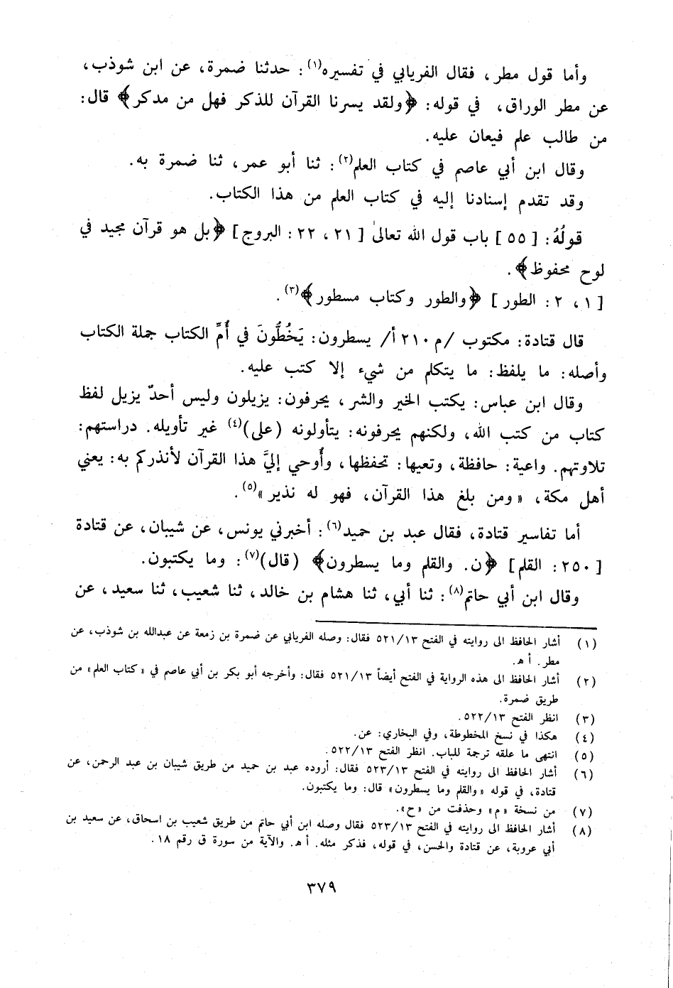 أما تفاسير قَتَادَة فَقَالَ عبد بن حميد أَخْبرنِي يُونُس عَن شَيبَان عَن قَتَادَة 1 2 الْقَلَم {ن والقلم وَمَا يسطرون} قَالَ وَمَا يَكْتُبُونَ
