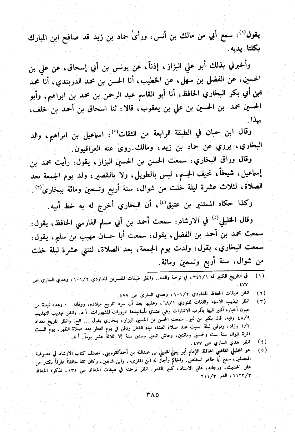 وَقَالَ الخليلي فِي الْإِرْشَاد سَمِعت أَحْمد بن أبي مُسلم الْفَارِسِي الْحَافِظ يَقُول سَمِعت مُحَمَّد بن أَحْمد بن الْفضل يَقُول سَمِعت أَبَا حسان مهيب بن سليم يَقُول سَمِعت البُخَارِيّ يَقُول ولدت يَوْم الْجُمُعَة بعد الصَّلَاة لثنتي عشرَة لَيْلَة خلت من شَوَّال سنة أَربع وَتِسْعين وَمِائَة