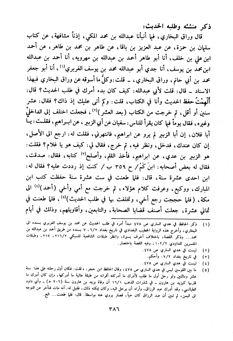 قَالَ وراق البُخَارِيّ فِيمَا أَنبأَنَا عبد الله بن مُحَمَّد الْمَكِّيّ إِذْنا مشافهة عَن كتاب سُلَيْمَان بن حَمْزَةَ عَنْ عَبْدِ الْعَزِيزِ بْنِ باقا عَن طَاهِر بن مُحَمَّد بن طَاهِر عَن أَحْمد ابْن عَليّ بن خلف أَنا أَبُو طَاهِر أَحْمد بن عبد الله بن مهرويه أَنا أَحْمد بن عبد الله ابْن مُحَمَّد بن يُوسُف أَنا جدي أَبُو عبد الله مُحَمَّد بن يُوسُف الْفربرِي أَنا أَبُو جَعْفَر مُحَمَّد بن أبي حَاتِم وراق البُخَارِيّ قلت وكل مَا أسوقه عَن وراق البُخَارِيّ فَبِهَذَا الْإِسْنَاد قَالَ قلت لأبي عبد الله كَيفَ كَانَ بَدْء أَمرك فِي طلب الحَدِيث قَالَ ألهمت حفظ الحَدِيث وَأَنا فِي الْكتاب قلت وَكم أَتَى عَلَيْك إِذْ ذَاك فَقَالَ عشر سِنِين أَو أقل ثمَّ خرجت من الْكتاب بعد الْعشْر فَجعلت اخْتلف إِلَى الداخلي وَغَيره فَقَالَ يَوْمًا فِيمَا كَانَ يقْرَأ للنَّاس سُفْيَان عَن أبي الزبير عَن إِبْرَاهِيم فَقلت يَا أَبَا فلَان إِن أَبَا الزبير لم يرو عَن إِبْرَاهِيم فَانْتَهرنِي فَقلت لَهُ ارْجع إِلَى الأَصْل إِن كَانَ عنْدك فَدخل وَنظر فِيهِ ثمَّ خرج فَقَالَ لي كَيفَ هُوَ يَا غُلَام فَقلت هُوَ الزبير بن عدي عَن إِبْرَاهِيم فَأخذ الْقَلَم وَأصْلح كِتَابه فَقَالَ صدقت فَقَالَ لَهُ بعض أَصْحَابه ابْن كم ح 359 ب كنت إِذْ رددت عَلَيْهِ فَقَالَ لَهُ ابْن إِحْدَى عشرَة سنة قَالَ فَلَمَّا طعنت فِي سِتّ عشرَة سنة حفظت كتب ابْن الْمُبَارك ووكيع وَعرفت كَلَام هَؤُلَاءِ ثمَّ خرجت مَعَ أُمِّي وَأخي أَحْمد إِلَى مَكَّة فَلَمَّا حججْت رَجَعَ أخي وَتَخَلَّفت بهَا فِي طلب الحَدِيث فَلَمَّا طعنت فِي ثَمَانِي عشرَة جعلت أصنف قضايا الصَّحَابَة وَالتَّابِعِينَ وأقاويلهم وَذَلِكَ فِي أَيَّام