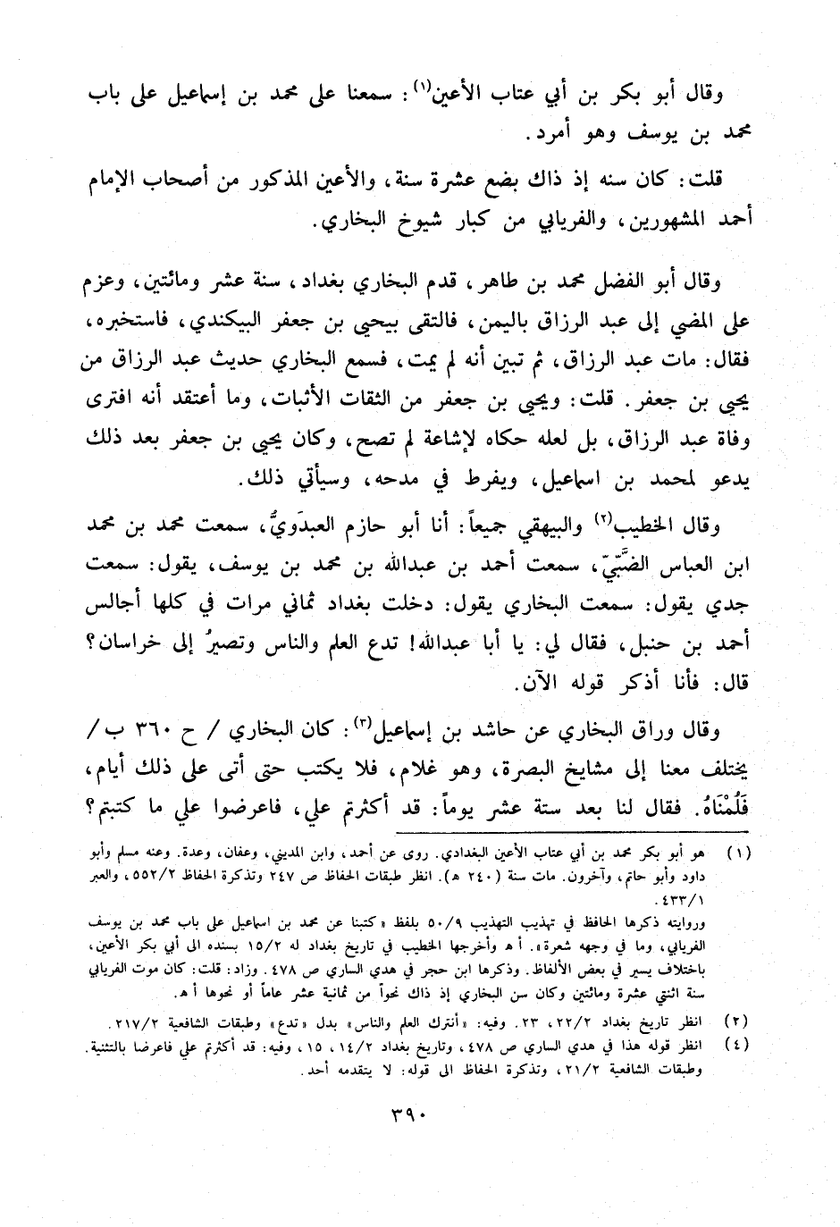 وَقَالَ الْخَطِيب وَالْبَيْهَقِيّ جَمِيعًا أَنا أَبُو حَازِم العبدوي سَمِعت مُحَمَّد بن مُحَمَّد ابْن الْعَبَّاس الضَّبِّيّ سَمِعت أَحْمد بن عبد الله بن مُحَمَّد بن يُوسُف يَقُول سَمِعت جدي يَقُول سَمِعت البُخَارِيّ يَقُول دخلت بَغْدَاد ثَمَانِي مَرَّات فِي كلهَا أجالس أَحْمد بن حَنْبَل فَقَالَ لي يَا أَبَا عبد الله تدع الْعلم وَالنَّاس وَتصير إِلَى خُرَاسَان قَالَ فَأَنا أذكر قَوْله الْآن