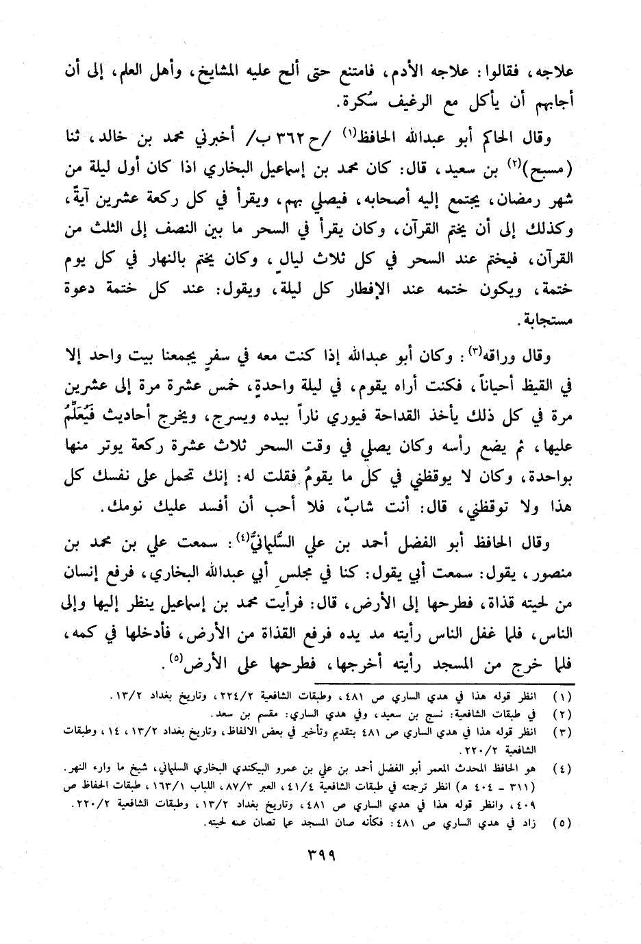 وَقَالَ الْحَاكِم أَبُو عبد الله الْحَافِظ ح 362 ب أَخْبرنِي مُحَمَّد بن خَالِد ثَنَا مسبح بن سعيد قَالَ كَانَ مُحَمَّد بن إِسْمَاعِيل البُخَارِيّ إِذا كَانَ أول لَيْلَة من شهر رَمَضَان يجْتَمع إِلَيْهِ أَصْحَابه فَيصَلي بهم وَيقْرَأ فِي كل رَكْعَة عشْرين آيَة وَكَذَلِكَ إِلَى أَن يخْتم الْقُرْآن وَكَانَ يقْرَأ فِي السحر مَا بَين النّصْف إِلَى الثُّلُث من الْقُرْآن فيختم عِنْد السحر فِي كل ثَلَاث لَيَال وَكَانَ يخْتم بِالنَّهَارِ فِي كل يَوْم ختمة وَيكون خَتمه عِنْد الْإِفْطَار كل لَيْلَة وَيَقُول عِنْد كل ختمة دَعْوَة مستجابة