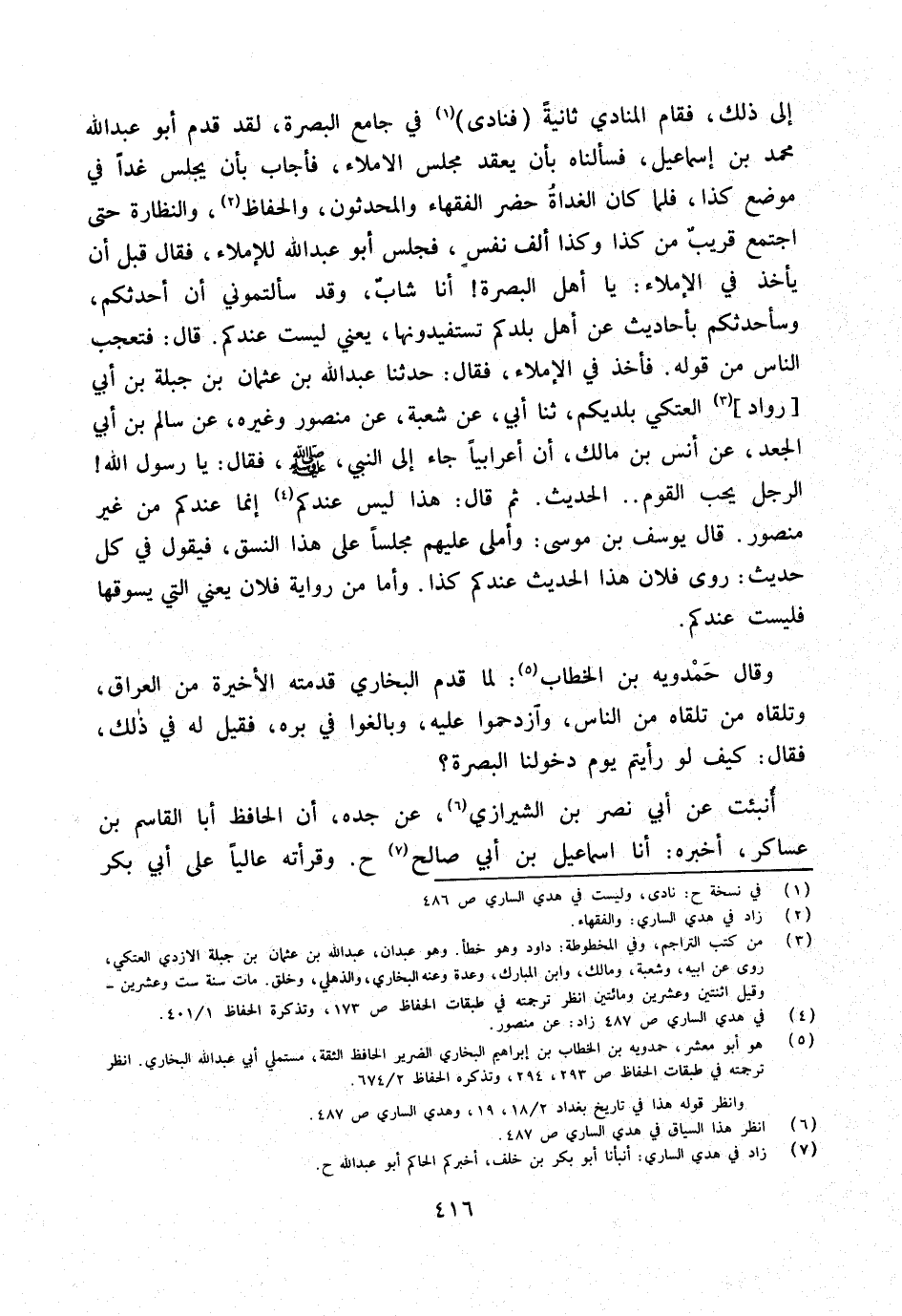 إِلَى ذَلِك فَقَامَ الْمُنَادِي ثَانِيَة فَنَادَى فِي جَامع الْبَصْرَة لقد قدم أَبُو عبد الله مُحَمَّد بن إِسْمَاعِيل فَسَأَلْنَاهُ بِأَن يعْقد مجْلِس الْإِمْلَاء فَأجَاب بِأَن يجلس غَدا فِي مَوضِع كَذَا فَلَمَّا كَانَ الْغَدَاة حضر الْفُقَهَاء والمحدثون والحفاظ والنظارة حَتَّى اجْتمع قريب من كَذَا وَكَذَا ألف نفس فَجَلَسَ أَبُو عبد الله للإملاء فَقَالَ قبل أَن يَأْخُذ فِي الْإِمْلَاء يَا أهل الْبَصْرَة أَنا شَاب وَقد سَأَلْتُمُونِي أَن أحدثكُم وَسَأُحَدِّثُكُمْ بِأَحَادِيث عَن أهل بلدكم تستفيدونها يَعْنِي لَيست عنْدكُمْ قَالَ فتعجب النَّاس من قَوْله فَأخذ فِي الْإِمْلَاء فَقَالَ حَدَّثَنَا عَبْدُ اللَّهِ بْنُ عُثْمَانَ بْنِ جَبَلَةَ بْنِ رَوَّادٍ الْعَتَكِيُّ بلديكم ثَنَا أَبِي عَنْ شُعْبَةَ عَنْ مَنْصُورٍ وَغَيْرِهِ عَنْ سَالِمِ بْنِ أَبِي الْجَعْدُ عَنْ أَنَسِ بْنِ مَالِكٍ أَنَّ أَعْرَابِيًّا جَاءَ إِلَى النَّبِيِّ صَلَّى اللَّهُ عَلَيْهِ وَسَلَّمَ فَقَالَ يَا رَسُولَ اللَّهِ الرَّجُلُ يُحِبُّ الْقَوْمَ الْحَدِيثَ ثمَّ قَالَ هَذَا لَيْسَ عنْدكُمْ إِنَّمَا عنْدكُمْ من غير مَنْصُور قَالَ يُوسُف بن مُوسَى وأملى عَلَيْهِم مَجْلِسا على هَذَا النسق فَيَقُول فِي كل حَدِيث روى فلَان هَذَا الحَدِيث عنْدكُمْ كَذَا وَأما من رِوَايَة فلَان يَعْنِي الَّتِي يَسُوقهَا فَلَيْسَتْ عنْدكُمْ