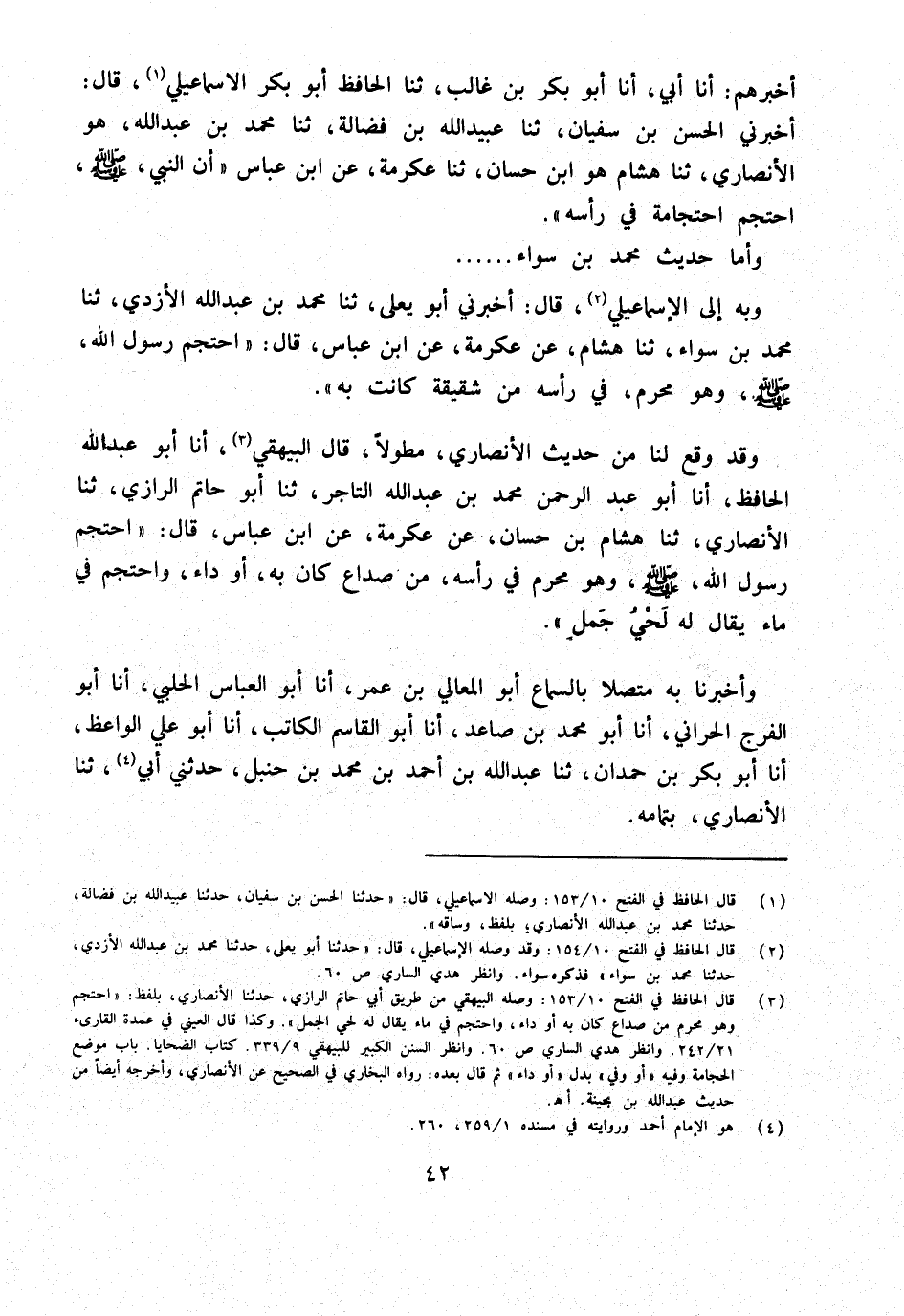 وَقد وَقع لنا من حَدِيث الْأنْصَارِيّ مطولا قَالَ الْبَيْهَقِيّ أَنا أَبُو عبد الله الْحَافِظ أَنا أَبُو عَبْدِ الرَّحْمَنِ مُحَمَّدُ بْنُ عَبْدِ اللَّهِ التَّاجِرُ ثَنَا أَبُو حَاتِمٍ الرَّازِيُّ ثَنَا الأَنْصَارِيُّ ثَنَا هِشَامُ بْنِ حَسَّانٍ عَنْ عِكْرِمَةَ عَنِ ابْنِ عَبَّاسٍ قَالَ احْتَجَمَ رَسُولُ الله صلى الله عَلَيْهِ وَسلم وَهُوَ مُحْرِمٌ فِي رَأْسِهِ مِنْ صُدَاعٍ كَانَ بِهِ أَوْ دَاءٍ وَاحْتَجَمَ فِي مَاءٍ يُقَالُ لَهُ لَحْيُ جَمَلٍ