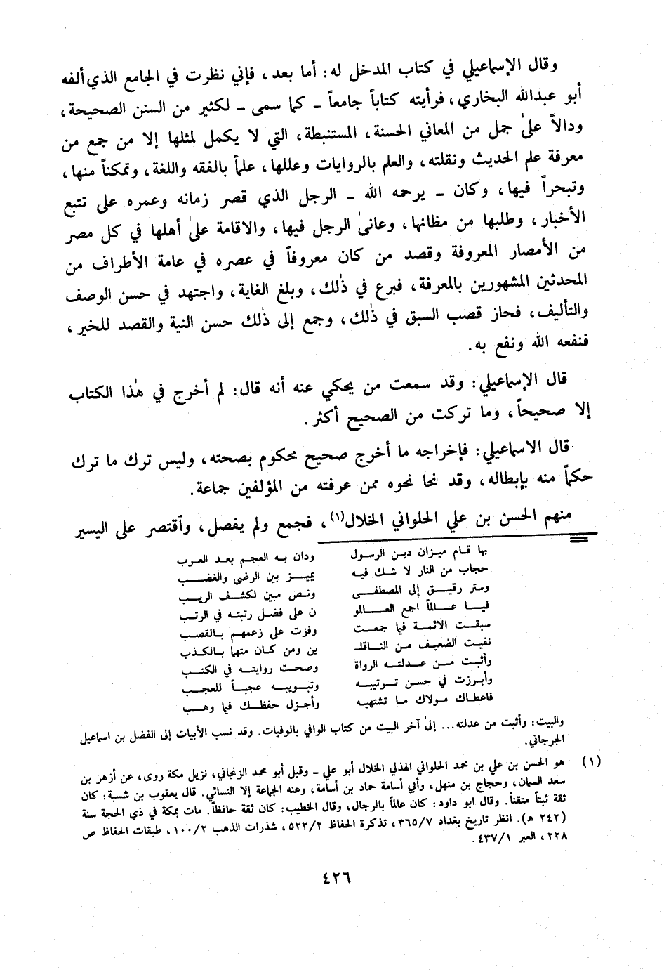 وَقَالَ الْإِسْمَاعِيلِيّ فِي كتاب الْمدْخل لَهُ أما بعد فَإِنِّي نظرت فِي الْجَامِع الَّذِي أَلفه أَبُو عبد الله البُخَارِيّ فرأيته كتاب جَامعا كَمَا سمى لكثير من السّنَن الصَّحِيحَة ودالا على جمل من الْمعَانِي الْحَسَنَة المستنبطة الَّتِي لَا يكمل لمثلهَا إِلَّا من جمع من معرفَة علم الحَدِيث ونقلته وَالْعلم بالروايات وعللها علما بالفقه واللغة وتمكنا مِنْهَا وتبحرا فِيهَا وَكَانَ يرحمه الله الرجل الَّذِي قصر زَمَانه وعمره على تتبع الْأَخْبَار وطلبها من مظانها وعانى الرجل فِيهَا وَالْإِقَامَة على أَهلهَا فِي كل مصر من الْأَمْصَار الْمَعْرُوفَة وَقصد من كَانَ مَعْرُوفا فِي عصره فِي عَامَّة الْأَطْرَاف من الْمُحدثين الْمَشْهُورين بالمعرفة فبرع فِي ذَلِك وَبلغ الْغَايَة واجتهد فِي حسن الْوَصْف والتأليف فحاز قصب السَّبق فِي ذَلِك وَجمع إِلَى ذَلِك حسن النِّيَّة وَالْقَصْد للخير فنفعه الله ونفع بِهِ