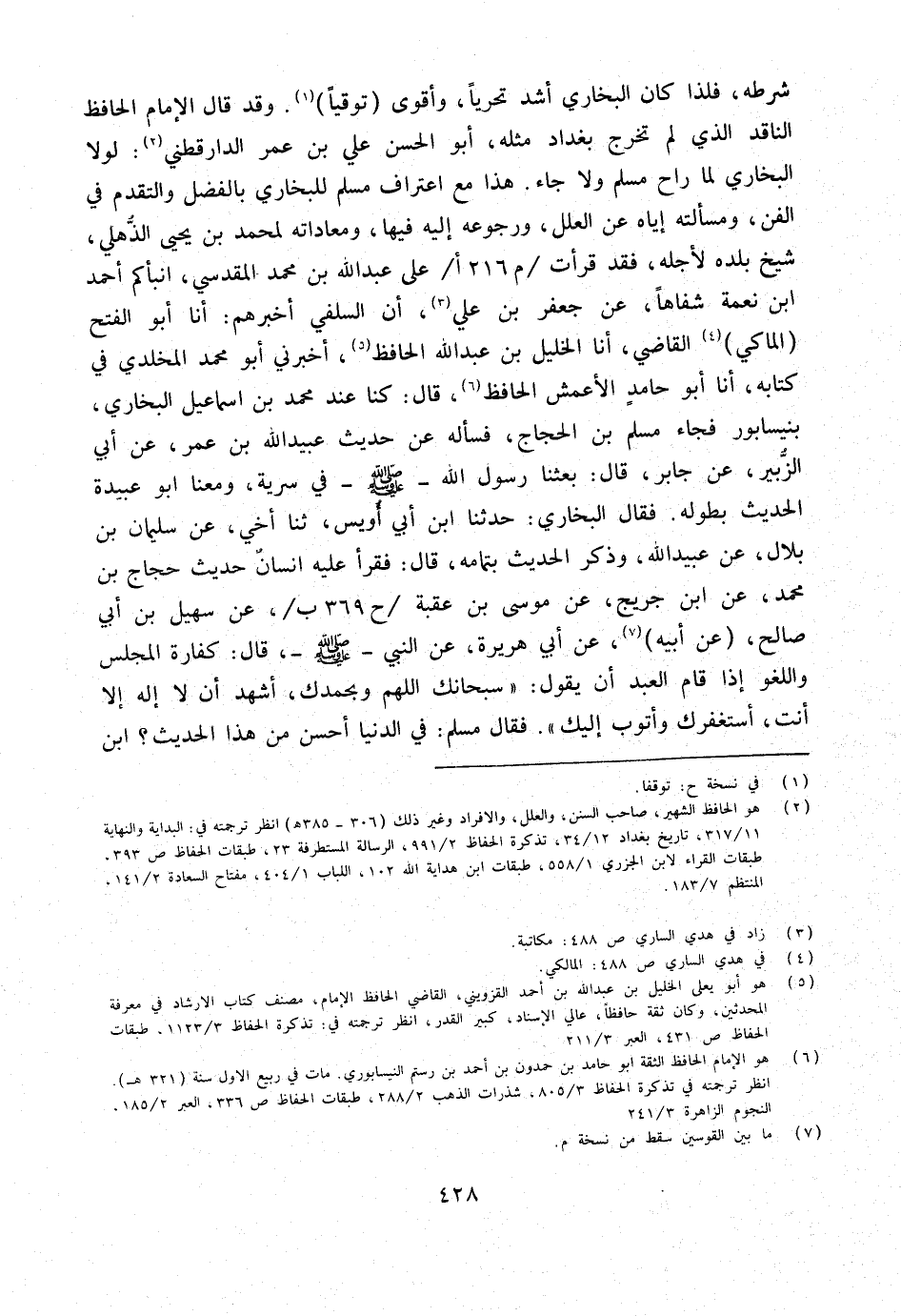 شَرطه فَلِذَا كَانَ البُخَارِيّ أَشد تحريا وَأقوى توقيا وَقد قَالَ الإِمَام الْحَافِظ النَّاقِد الَّذِي لم تخرج بَغْدَاد مثله أَبُو الْحسن عَليّ بن عمر الدَّارَقُطْنِيّ لَوْلَا البُخَارِيّ لما رَاح مُسلم وَلَا جَاءَ هَذَا مَعَ اعْتِرَاف مُسلم للْبُخَارِيّ بِالْفَضْلِ والتقدم فِي الْفَنّ ومسألته إِيَّاه عَن الْعِلَل ورجوعه إِلَيْهِ فِيهَا ومعاداته لمُحَمَّد بن يحيى الذهلي شيخ بَلَده لأَجله فقد قَرَأت م 216 أعلى عبد الله بن مُحَمَّد الْمَقْدِسِي أنبأكم أَحْمد ابْن نعْمَة شفاها عَن جَعْفَر بن عَليّ أَن السلَفِي أخْبرهُم أَنا أَبُو الْفَتْحِ الْمَاكِيُّ الْقَاضِي أَنا الْخَلِيلُ بْنُ عَبْدِ اللَّهِ الْحَافِظُ أَخْبَرَنِي أَبُو مُحَمَّدٍ الْمَخْلَدِيُّ فِي كِتَابِهِ أَنا أَبُو حَامِدٍ الأَعْمَشُ الْحَافِظُ قَالَ كُنَّا عِنْدَ مُحَمَّدِ بْنِ إِسْمَاعِيلَ الْبُخَارِيِّ بِنَيْسَابُورَ فَجَاءَ مُسْلِمُ بْنُ الْحَجَّاجِ فَسَأَلَهُ عَنْ حَدِيث عبيد الله بْنِ عُمَرَ عَنْ أَبِي الزُّبَيْرِ عَنْ جَابِرٍ قَالَ بَعَثَنَا رَسُولُ الله صلى الله عَلَيْهِ وَسلم فِي سَرِيَّةٍ وَمَعَنَا أَبُو عُبَيْدَةَ الْحَدِيثَ بِطُولِهِ فَقَالَ البُخَارِيّ حَدَّثَنَا ابْنُ أَبِي أُوَيْسٍ ثَنَا أَخِي عَن سُلَيْمَان بن بِلَال عَن عبيد الله وَذَكَرَ الْحَدِيثَ بِتَمَامِهِ قَالَ فَقَرَأَ عَلَيْهِ إِنْسَانٌ حَدِيثَ حَجَّاجِ بْنِ مُحَمَّد عَن ابْن جريج عَن مُوسَى بن عقبَة ح 369 ب عَن سُهَيْل بن أبي صَالح عَن أَبِيه عَن أبي هُرَيْرَة عَن النَّبِي صلى الله عَلَيْهِ وَسَلَّمَ قَالَ كَفَّارَةُ الْمَجْلِسِ وَاللَّغْوِ إِذَا قَامَ الْعَبْدُ أَنْ يَقُولَ سُبْحَانَكَ اللَّهُمَّ وَبِحَمْدِكَ أَشْهَدُ أَنْ لَا إِلَهَ إِلا أَنْتَ أَسْتَغْفِرُكَ وَأَتُوبُ إِلَيْكَ فَقَالَ مُسلم فِي الدُّنْيَا أحسن من هَذَا الحَدِيث ابْن