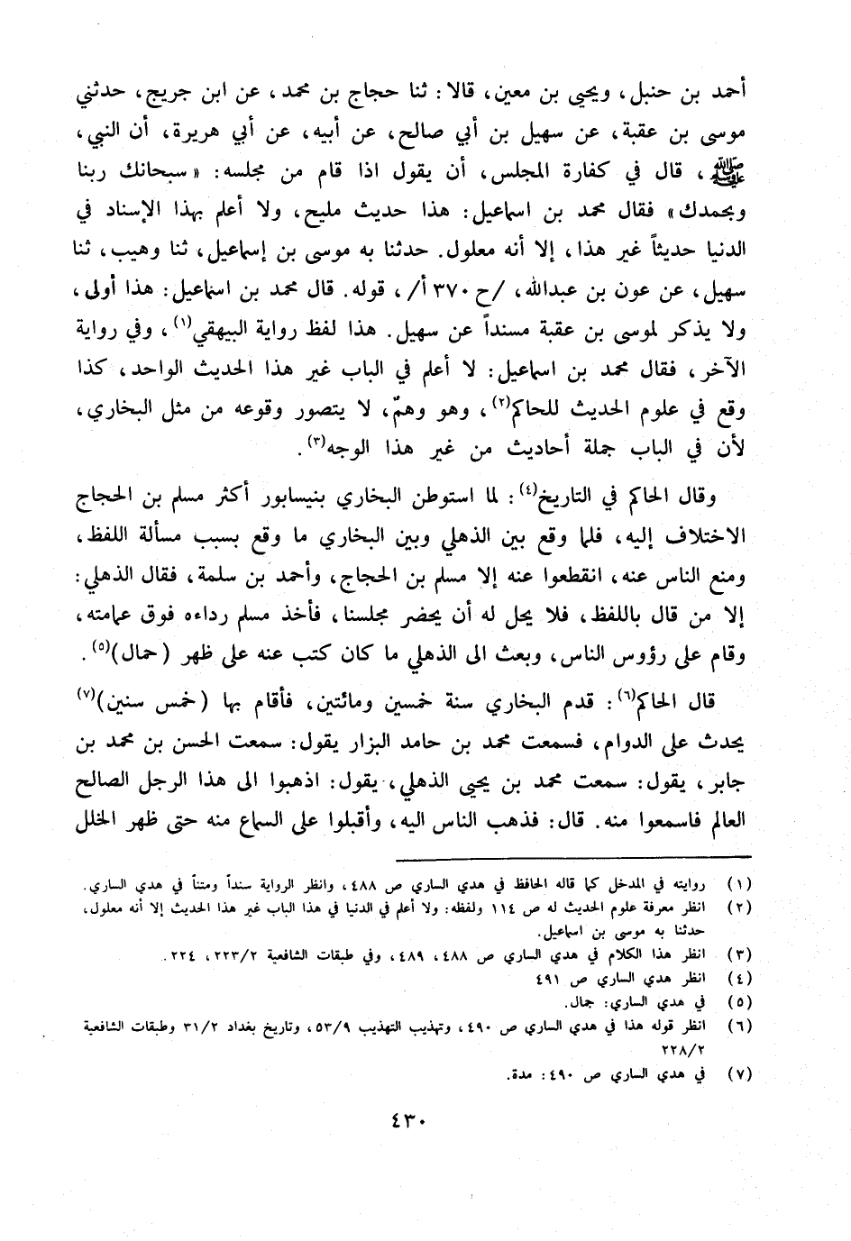 أَحْمَدُ بْنُ حَنْبَلٍ وَيَحْيَى بْنُ مَعِينٍ قَالا ثَنَا حَجَّاجُ بْنُ مُحَمَّدٍ عَنِ ابْنِ جُرَيْجٍ حَدَّثَنِي مُوسَى بْنِ عُقْبَةَ عَنْ سُهَيْلِ بن أبي صَالح عَن أَبِيه عَنْ أَبِي هُرَيْرَةَ أَنَّ النَّبِيَّ صَلَّى اللَّهُ عَلَيْهِ وَسَلَّمَ قَالَ فِي كَفَّارَةِ الْمَجْلِسِ أَنْ يَقُولَ إِذَا قَامَ مِنْ مَجْلِسِهِ سُبْحَانَكَ رَبَّنَا وَبِحَمْدِكَ فَقَالَ مُحَمَّد بن إِسْمَاعِيل هَذَا حَدِيث مليح وَلَا أعلم بِهَذَا الْإِسْنَاد فِي الدُّنْيَا حَدِيثا غير هَذَا إِلَّا أَنه مَعْلُول حَدثنَا بِهِ مُوسَى بن إِسْمَاعِيل ثَنَا وهيب ثَنَا سُهَيْل عَنْ عَوْنِ بْنِ عَبْدِ اللَّهِ ح 370 أقَوْله قَالَ مُحَمَّد بن إِسْمَاعِيل هَذَا أولى وَلَا يذكر لمُوسَى بن عقبَة مُسْندًا عَن سُهَيْل هَذَا لفظ رِوَايَة الْبَيْهَقِيّ وَفِي رِوَايَة الآخر فَقَالَ مُحَمَّد بن إِسْمَاعِيل لَا أعلم فِي الْبَاب غير هَذَا الحَدِيث الْوَاحِد كَذَا وَقع فِي عُلُوم الحَدِيث للْحَاكِم وَهُوَ وهم لَا يتَصَوَّر وُقُوعه من مثل البُخَارِيّ لِأَن فِي الْبَاب جملَة أَحَادِيث من غير هَذَا الْوَجْه
