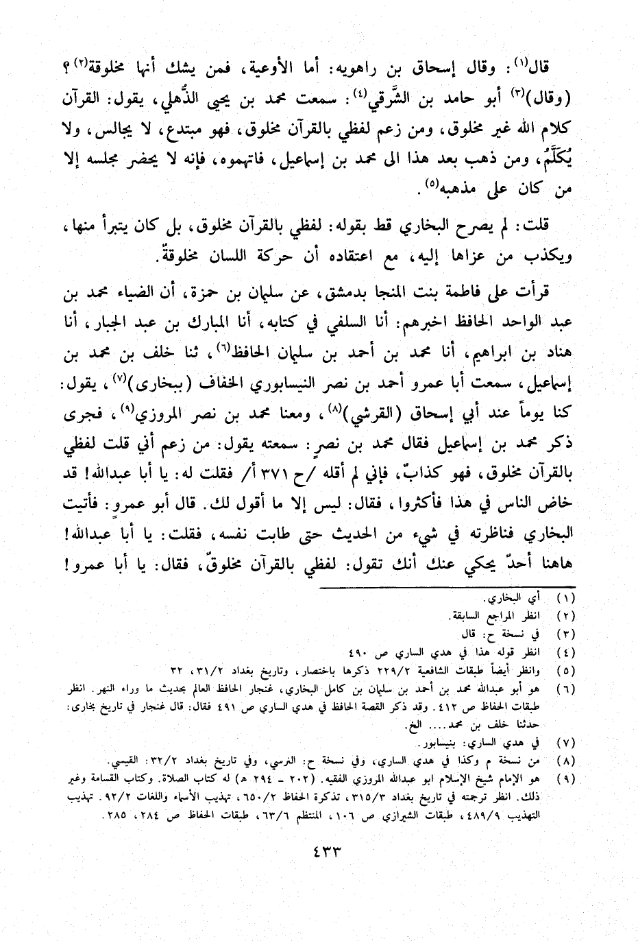 قَرَأت عَلَى فَاطِمَةَ بِنْتِ الْمُنَجَّا بِدِمَشْقَ عَن سُلَيْمَان بن حَمْزَة أَن الضياء مُحَمَّد بن عبد الْوَاحِد الْحَافِظ أخْبرهُم أَنا السلَفِي فِي كِتَابه أَنا الْمُبَارك بن عبد الْجَبَّار أَنا هناد بن إِبْرَاهِيم أَنا مُحَمَّدُ بْنُ أَحْمَدَ بْنِ سُلَيْمَان الْحَافِظ ثَنَا خلف بن مُحَمَّد بن إِسْمَاعِيل سَمِعت أَبَا عَمْرو أَحْمد بن نصر النَّيْسَابُورِي الْخفاف ببخارى يَقُول كُنَّا يَوْمًا عِنْد أبي إِسْحَاق الْقرشِي ومعنا مُحَمَّد بن نصر الْمروزِي فَجرى ذكر مُحَمَّد بن إِسْمَاعِيل فَقَالَ مُحَمَّد بن نصر سمعته يَقُول من زعم أَنِّي قلت لَفْظِي بِالْقُرْآنِ مَخْلُوق فَهُوَ كَذَّاب فَإِنِّي لم أَقَله ح 371 أفَقلت لَهُ يَا أَبَا عبد الله قد خَاضَ النَّاس فِي هَذَا فَأَكْثرُوا فَقَالَ لَيْسَ إِلَّا مَا أَقُول لَك قَالَ أَبُو عَمْرو فَأتيت البُخَارِيّ فناظرته فِي شَيْء من الحَدِيث حَتَّى طابت نَفسه فَقلت يَا أَبَا عبد الله هَا هُنَا أحد يَحْكِي عَنْك أَنَّك تَقول لَفْظِي بِالْقُرْآنِ مَخْلُوق فَقَالَ يَا أَبَا عَمْرو