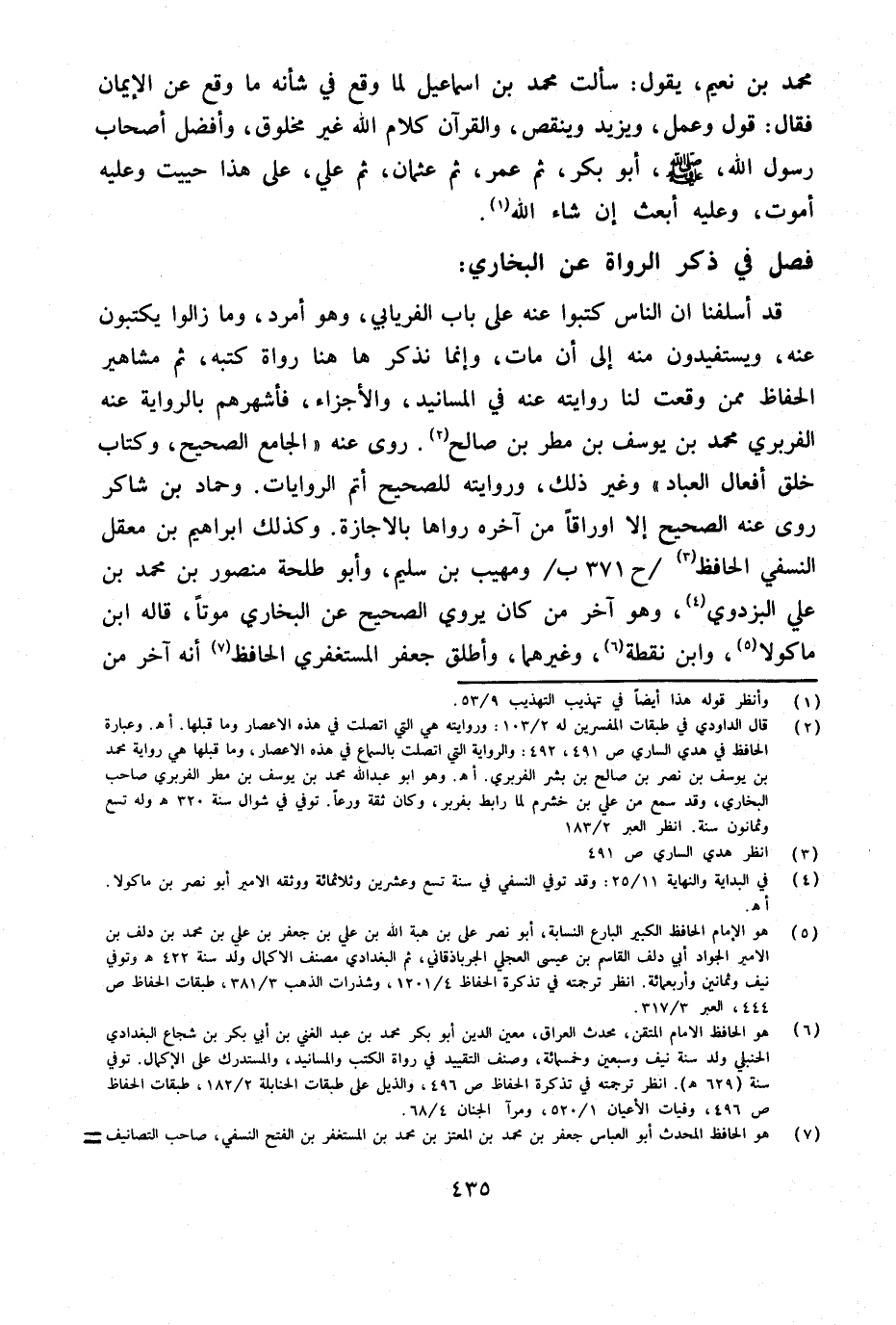 مُحَمَّد بن نعيم يَقُول سَأَلت مُحَمَّد بن إِسْمَاعِيل لما وَقع فِي شَأْنه مَا وَقع عَن الْإِيمَان فَقَالَ قَول وَعمل وَيزِيد وَينْقص وَالْقُرْآن كَلَام الله غير مَخْلُوق وَأفضل أَصْحَاب رَسُول الله صلى الله عَلَيْهِ وَسلم أَبُو بكر ثمَّ عمر ثمَّ عُثْمَان ثمَّ عَليّ على هَذَا حييت وَعَلِيهِ أَمُوت وَعَلِيهِ أبْعث إِن شَاءَ الله