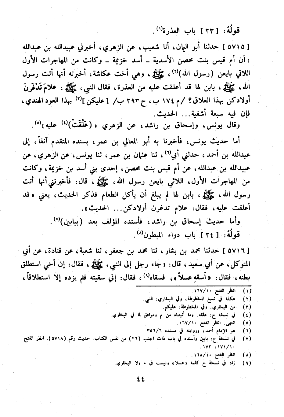 5715 - حَدَّثَنَا أَبُو الْيَمَانِ أَنا شُعَيْبٌ عَنِ الزُّهْرِيِّ أَخْبرنِي عبيد الله بْنُ عَبْدِ اللَّهِ أَنَّ أُمَّ قَيْسٍ بِنْتَ مِحْصَنٍ الأَسَدِيَّةَ أَسَدَ خُزَيْمَةَ وَكَانَتْ مِنَ الْمُهَاجِرَاتِ الأُوَلِ اللاتِي بَايَعْنَ رَسُولَ اللَّهِ صَلَّى اللَّهُ عَلَيْهِ وَسَلَّمَ وَهِيَ أُخْتُ عُكَاشَةَ أَخْبَرَتْهُ أَنَّهَا أَتَتْ رَسُولَ الله صلى الله عَلَيْهِ وَسلم بِابْنٍ لَهَا قَدْ أَعْلَقَتْ عَلَيْهِ مِنَ الْعُذْرَةِ فَقَالَ النَّبِيُّ صَلَّى اللَّهُ عَلَيْهِ وَسَلَّمَ عَلامَ تَدْغَرْنَ أَوْلَادكُنَّ بِهَذَا العلاق م 174 ب ح 293 ب عَلَيْكُنَّ بِهَذَا الْعُودِ الْهِنْدِيِّ فَإِنَّ فِيهِ سَبْعَةَ أَشْفِيَةٍ الْحَدِيثَ