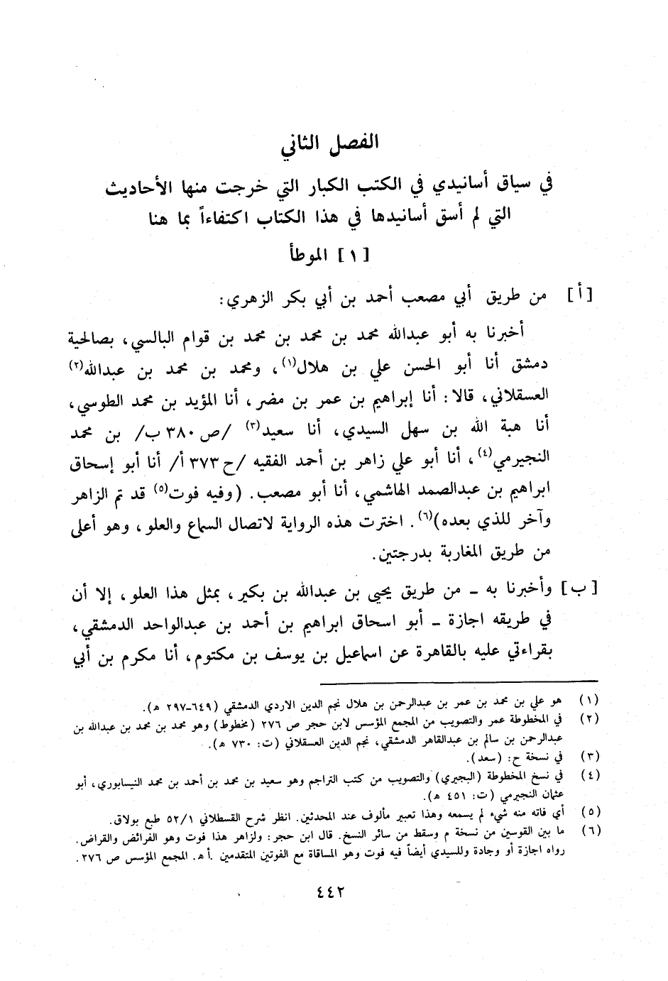 أخبرنَا بِهِ أَبُو عبد الله مُحَمَّد بن مُحَمَّد بن مُحَمَّد بن قوام البالسي بصالحية دمشق أَنا أَبُو الْحسن عَليّ بن هِلَال ومُحَمَّد بن مُحَمَّد بن عبد الله الْعَسْقَلَانِي قَالَا أَنا إِبْرَاهِيم بْنُ عُمَرَ بْنِ مُضَرَ أَنا الْمُؤَيد بن مُحَمَّد الطوسي أَنا هبة الله بن سهل السيدي أَنا سعيد ص 380 ب بن مُحَمَّد النجيرمي أَنا أَبُو عَليّ زَاهِر بن أَحْمد الْفَقِيه ح 373 أأَنا أَبُو إِسْحَاق إِبْرَاهِيم بن عبد الصَّمد الْهَاشِمِي أَنا أَبُو مُصعب وَفِيه فَوت قد تمّ الزَّاهِر وَآخر للَّذي بعده اخْتَرْت هَذِه الرِّوَايَة لاتصال السماع والعلو وَهُوَ أَعلَى من طَرِيق المغاربة بدرجتين ب وَأخْبرنَا بِهِ من طَرِيق يحيى بْنُ عَبْدِ اللَّهِ بْنِ بُكَيْرٍ بِمثل هَذَا الْعُلُوّ إِلَّا أَن فِي طَرِيقه إجَازَة أَبُو إِسْحَاق إِبْرَاهِيم بن أَحْمد بن عبد الْوَاحِد الدِّمَشْقِي بِقِرَاءَتِي عَلَيْهِ بِالْقَاهِرَةِ عَن إِسْمَاعِيل بن يُوسُف بن مَكْتُوم أَنا مكرم بن أبي