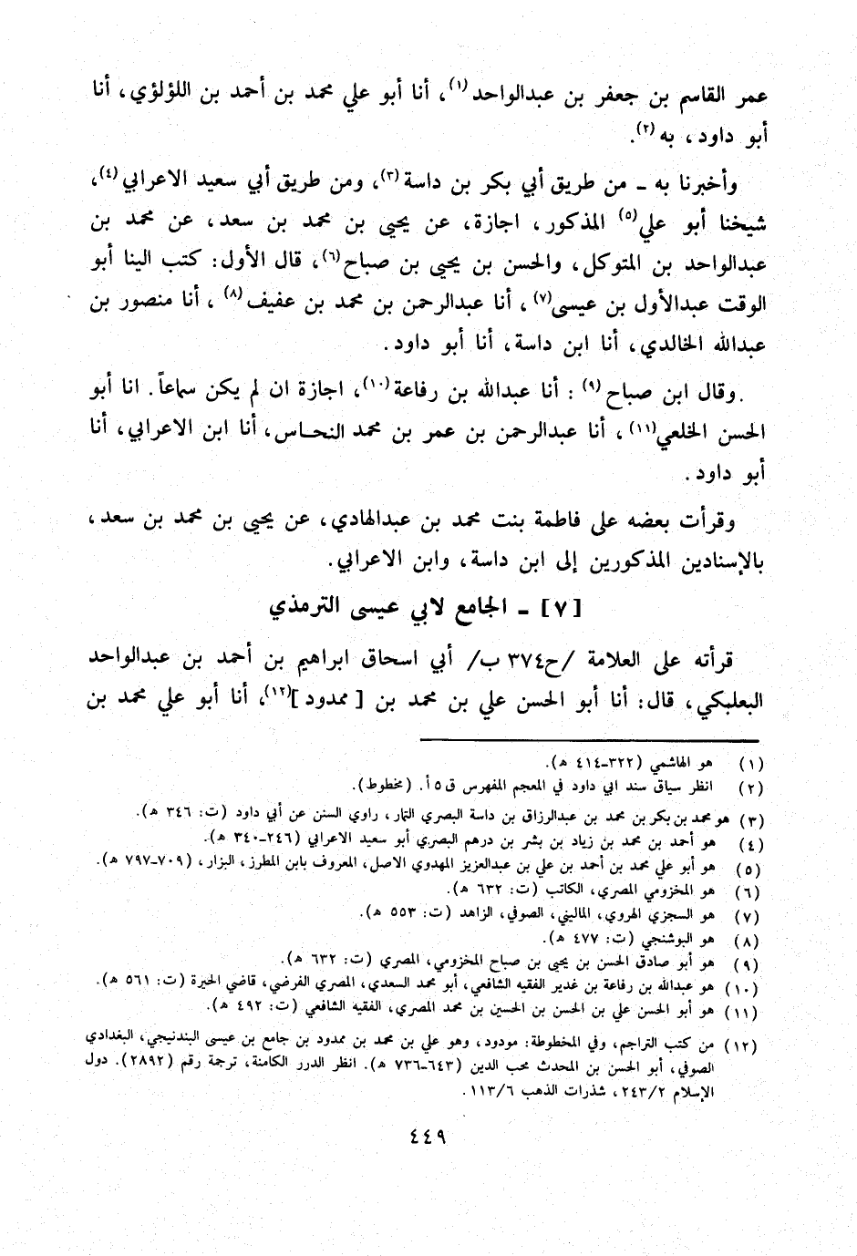 وَأخْبرنَا بِهِ من طَرِيق أبي بكر بن داسة وَمن طَرِيق أبي سعيد الْأَعرَابِي شَيخنَا أَبُو عَليّ الْمَذْكُور إجَازَة عَن يحيى بن مُحَمَّد بن سعد عَن مُحَمَّد بن عبد الْوَاحِد بن المتَوَكل وَالْحسن بن يحيى بن صباح قَالَ الأول كتب إِلَيْنَا أَبُو الْوَقْت عبد الأول بن عِيسَى أَنا عَبْدُ الرَّحْمَنِ بْنُ مُحَمَّدٍ بن عفيف أَنا مَنْصُور بن عبد الله الخالدي أَنا ابْن داسة أَنا أَبُو دَاوُد