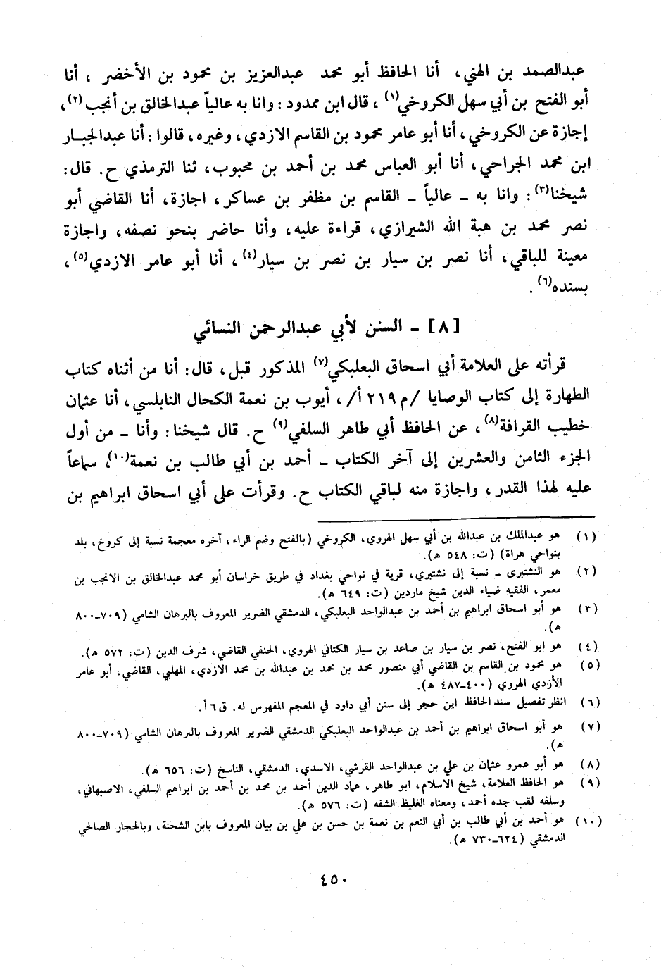 قرأته على الْعَلامَة أبي إِسْحَاق البعلبكي الْمَذْكُور قبل قَالَ أَنا من أثناه كتاب الطَّهَارَة إِلَى كتاب الْوَصَايَا م 219 أأَيُّوب بن نعْمَة الكحال النابلسي أَنا عُثْمَان خطيب القرافة عَن الْحَافِظِ أَبِي طَاهِرٍ السِّلَفِيِّ ح قَالَ شَيخنَا وَأَنا من أول الْجُزْء الثَّامِن وَالْعِشْرين إِلَى آخر الْكتاب أَحْمد بن أبي طَالب بن نعْمَة سَمَاعا عَلَيْهِ لهَذَا الْقدر وإجازة مِنْهُ لباقي الْكتاب ح وقرأت على أبي إِسْحَاق إِبْرَاهِيم بن