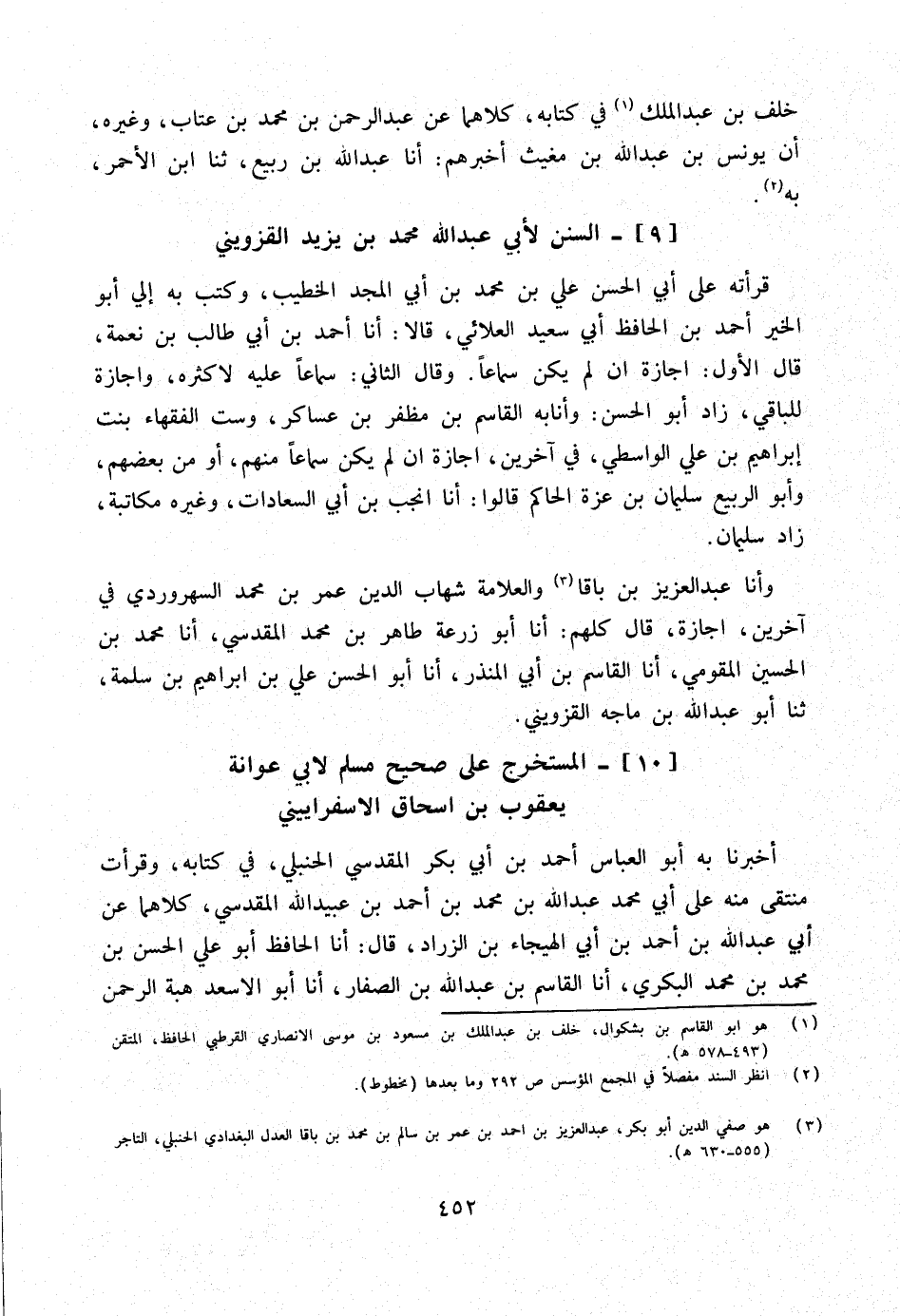 وَأَنا عبد الْعَزِيز بن باقا والعلامة شهَاب الدَّين عمر بن مُحَمَّد السهروردي فِي آخَرين إجَازَة قَالَ كلهم أَنا أَبُو زُرْعَةَ طَاهِرُ بْنُ مُحَمَّد الْمَقْدِسِي أَنا مُحَمَّد بن الْحُسَيْنِ الْمُقَوَّمِيُّ أَنا الْقَاسِمُ بْنُ أَبِي الْمُنْذِرِ أَنا أَبُو الْحَسَنِ عَليّ بن إِبْرَاهِيم بن سَلمَة ثَنَا أَبُو عبد الله بن مَاجَه الْقزْوِينِي