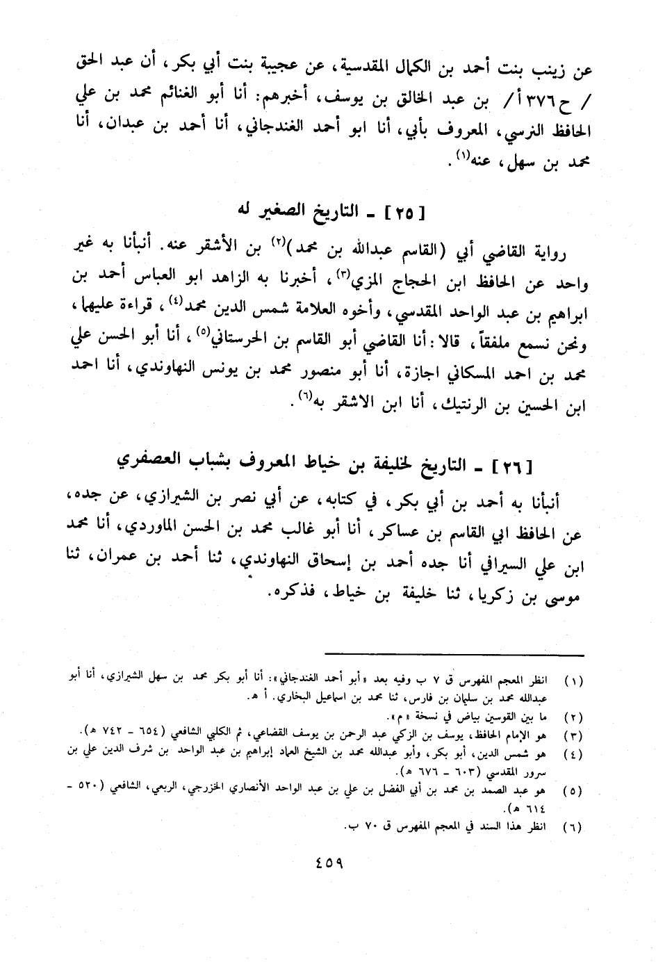 أَنبأَنَا بِهِ أَحْمد بن أبي بكر فِي كِتَابه عَن أبي نصر بن الشِّيرَازِيّ عَن جده عَن الْحَافِظ أبي الْقَاسِم بن عَسَاكِر أَنا أَبُو غَالِبٍ مُحَمَّدُ بْنُ الْحسن الْمَاوَرْدِيّ أَنا مُحَمَّد ابْن عَليّ السيرافي أَنا جده أَحْمد بن إِسْحَاق النهاوندي ثَنَا أَحْمد بن عمرَان ثَنَا مُوسَى بن زَكَرِيَّا ثَنَا خَليفَة بن خياط فَذكره